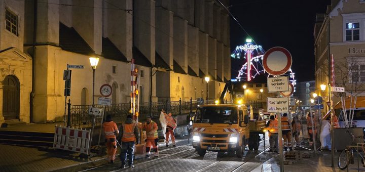 Der Weihnachtsmarkt ist zu Ende und sogleich haben Mitarbeiter von HASTRA und Hallescher Verkehrs AG (HAVAG) die Schranken und Poller abgebaut. Verschlossen wurden zudem die Öffnungen in der Fahrbahn, wo sich die Nagelsperren verbergen....