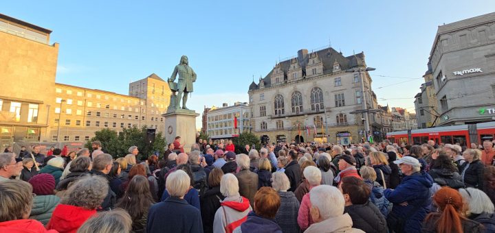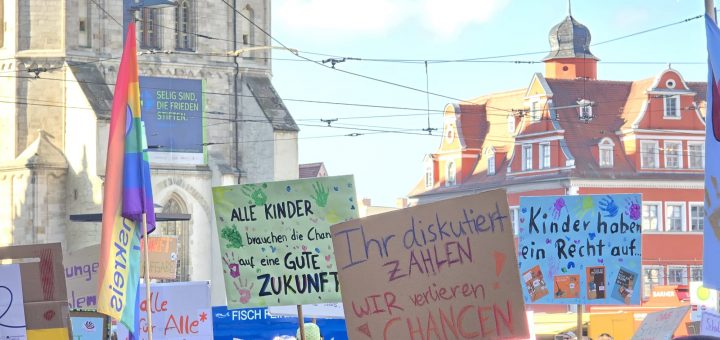 Rund 3000 Kinder, Jugendliche, Eltern sowie Mitarbeiterinnen und Mitarbeiter von Vereinen und Initiativen haben am Mittwoch auf dem Marktplatz in Halle (Saale) gegen drohende Kürzungen in der Kinder- und Jugendarbeit protestiert. Mit Transparenten, Musik...