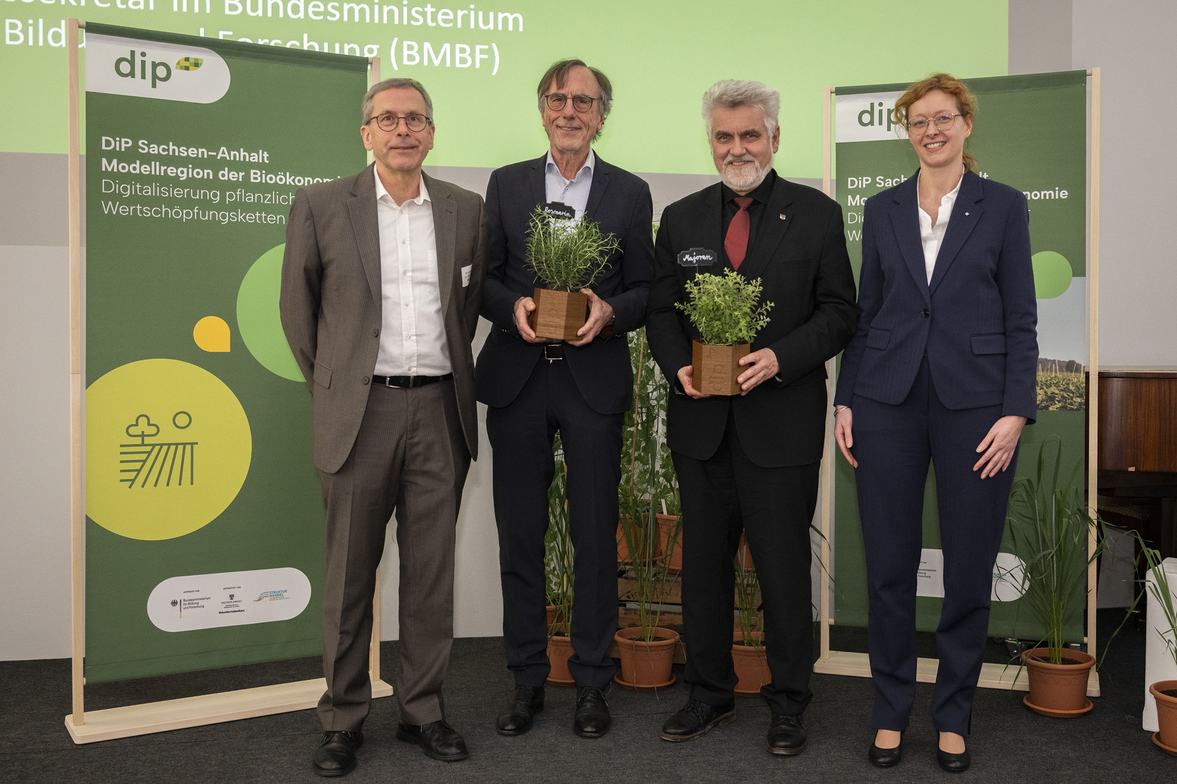 Der Süden Sachsen-Anhalts soll sich zur Modellregion für nachhaltige Bioökonomie entwickeln. Dieses Ziel verfolgt das Verbundvorhaben „Digitalisierung pflanzlicher Wertschöpfungsketten“ (DiP), das vom Bundesministerium für Bildung und Forschung (BMBF) im Rahmen des Strukturwandels in zwei Runden mit bis zu 105 Millionen Euro gefördert wird. Über den Stand der 19 Projekte der ersten Förderphase informierten sich Sachsen-Anhalts Wissenschaftsminister Prof. Dr. Armin Willingmann und BMBF-Staatssekretär Dr. Karl Eugen Huthmacher heute bei der offiziellen Auftaktveranstaltung. Die Martin-Luther-Universität Halle-Wittenberg (MLU) koordiniert das voraussichtlich bis 2032 laufende Vorhaben mit mehr als 40 Partnern aus Wissenschaft und Wirtschaft.