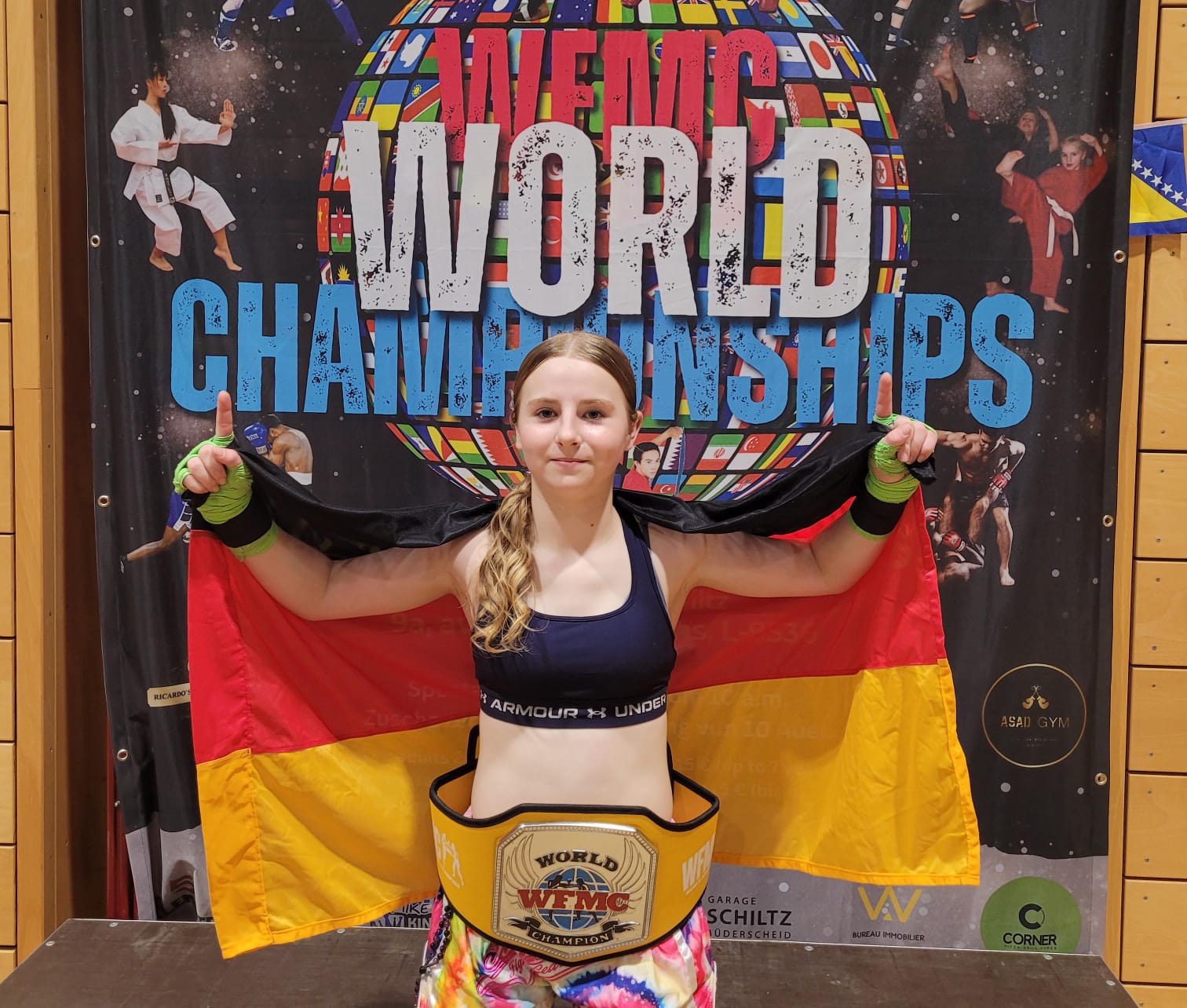 Am Samstagfand in Luxemburg die Weltmeisterschaft im Kickboxen statt. Dabei setzte sich Jasmin Müller eindrucksvoll gegen ein international stark besetztes Starterfeld durch und sicherte Deutschland den Titel in der Altersklasse 12-14 Jahre.