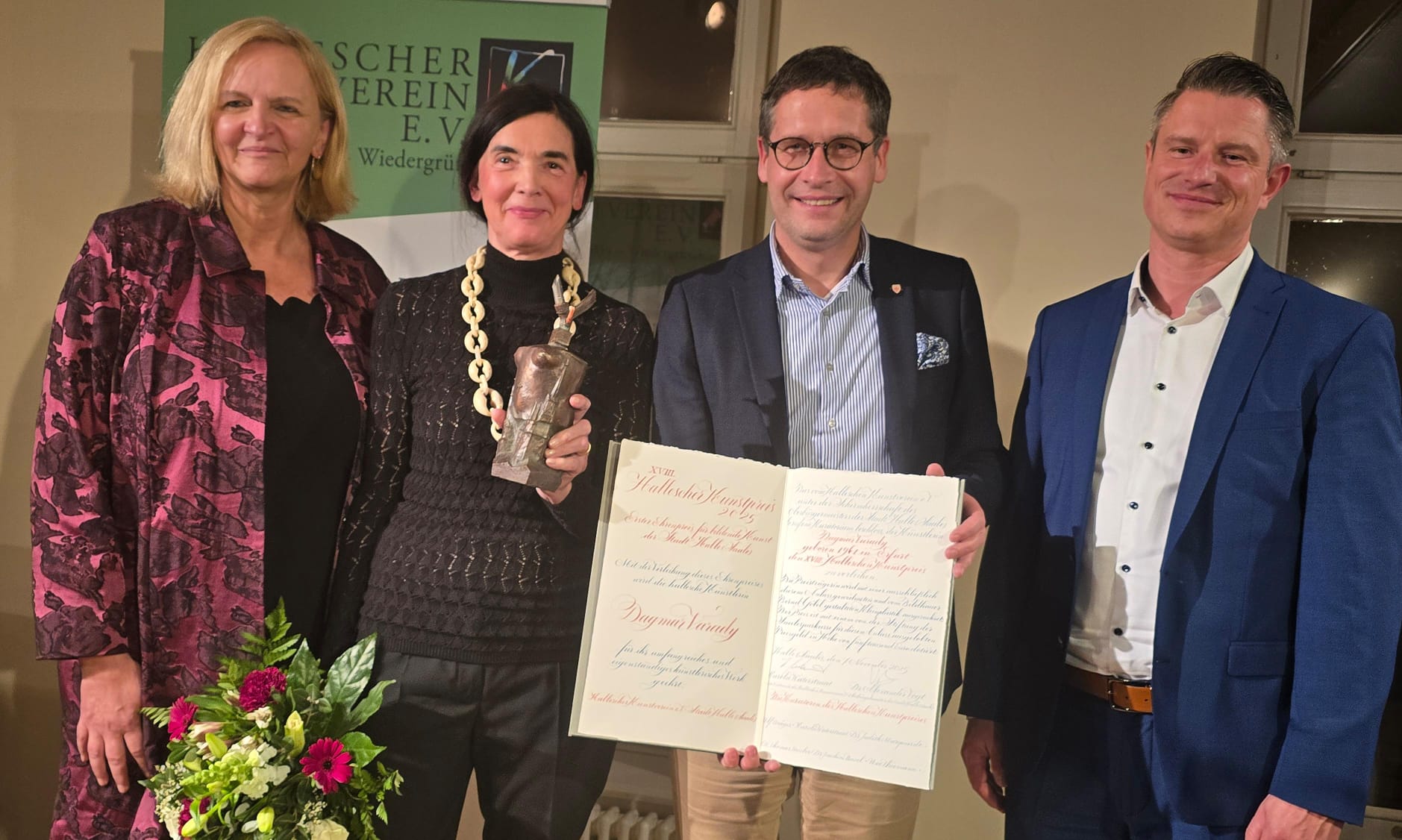 Am Freitagabend wurde im Literaturhaus Halle die hallesche Konzept- und Medienkünstlerin Dagmar Varady mit dem 18. Halleschen Kunstpreis geehrt. Die Auszeichnung, die seit 2008 jährlich für ein herausragendes künstlerisches Gesamtwerk verliehen wird, würdigt eine Persönlichkeit, deren Schaffen weit über die Stadtgrenzen hinausstrahlt. Die feierliche Preisverleihung, gemeinsam getragen von der Stadt Halle (Saale) und dem Halleschen Kunstverein e.V., wurde durch Oberbürgermeister Dr. Alexander Vogt, Karola Waterstraat (Vorsitzende des Halleschen Kunstvereins) und Marko Göpel von der Stiftung der Saalesparkasse Halle vorgenommen. Die Stiftung stellt das Preisgeld in Höhe von 5.000 Euro bereit. Neben der kalligraphisch gestalteten Urkunde von Barbara Dimanski erhielt die Preisträgerin die von Bernd Göbel geschaffene Kleinplastik – eine traditionsreiche Form der Ehrung, die die Verbundenheit der halleschen Kunstszene mit ihrem reichen bildhauerischen Erbe sichtbar macht.