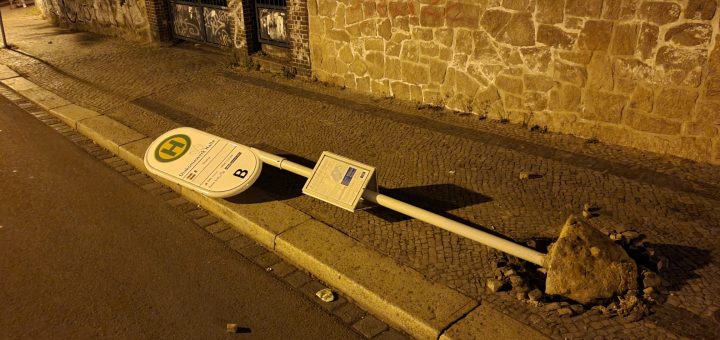 In der Nacht zu Samstag kam es im Mühlweg in Halle (Saale) zu einer Sachbeschädigung. Am Diakoniewerk wurde das Haltestellenschild aus der Verankerung gerissen.