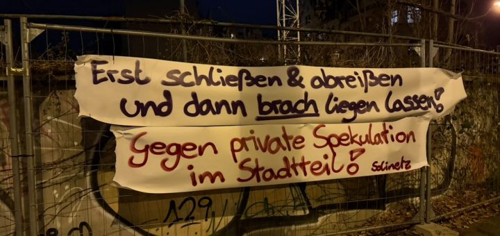 Auf dem Gelände der ehemaligen Schorre in der Willy-Brand-Straße in Halle (Saale) ruhen die Bauarbeiten. Inzwischen wurde die Protestplakat angebracht. “Erst schließen & abreißen und dann brach liegen lassen”, ist da zu lesen. Und...