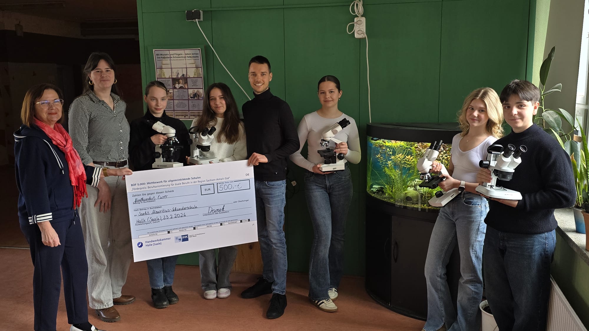 Für ihr herausragendes Engagement in der Berufsorientierung ist die St. Mauritius-Sekundarschule in Halle (Saale) bereits zum sechsten Mal im Wettbewerb „BOF 5.000“ ausgezeichnet worden. Am Montag erhielt die Schule ein Preisgeld in Höhe von 500 Euro. Mit dem Geld sollen neue Mikroskope angeschafft werden – eine Investition, die unmittelbar in den praxisnahen Unterricht einfließt. Überreicht wurde der Scheck von Simone Danek, Geschäftsführerin für Aus- und Weiterbildung bei der Industrie- und Handelskammer Halle-Dessau (IHK). Sie würdigte das kontinuierliche Engagement der Schule im Bereich der praxisorientierten Berufsbildung.