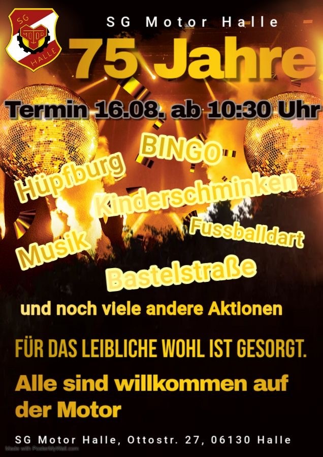Ein ganz besonderes Jubiläum steht an: Die SG Motor Halle feiert in diesem Jahr ihr 75-jähriges Bestehen – ein Meilenstein in der Vereinsgeschichte, der gebührend gefeiert wird. Höhepunkt der Feierlichkeiten ist das große Sommerfest am Samstag, den 16. August 2025, auf dem Sportplatz an der Ottostraße. Los geht’s ab 10:30 Uhr, und es wartet ein buntes Programm für Groß und Klein.