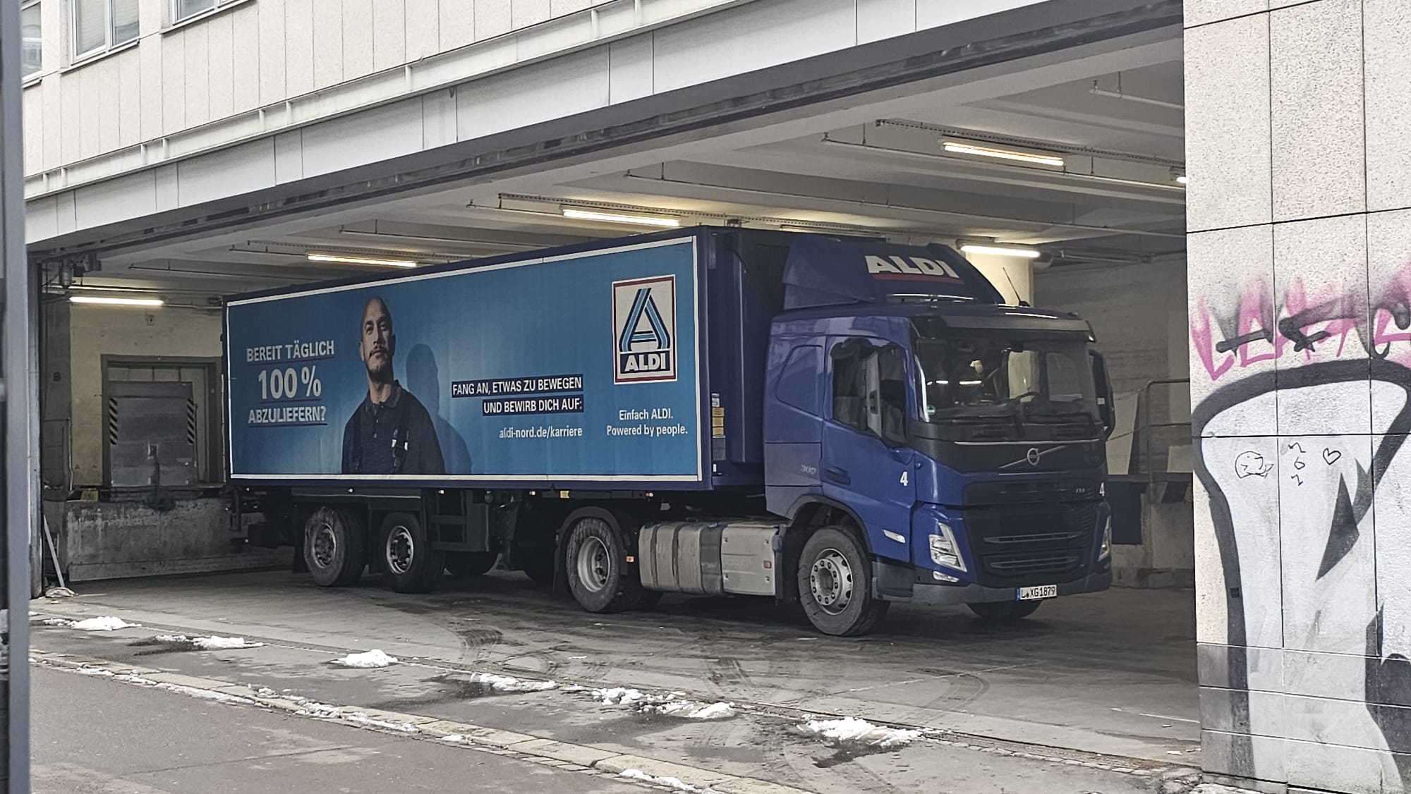 ALDI-LKW in der Warenannahme des ehemaligen Kaufhof-Gebäudes: “waren in der Innenstadt zu Testzwecken unterwegs”