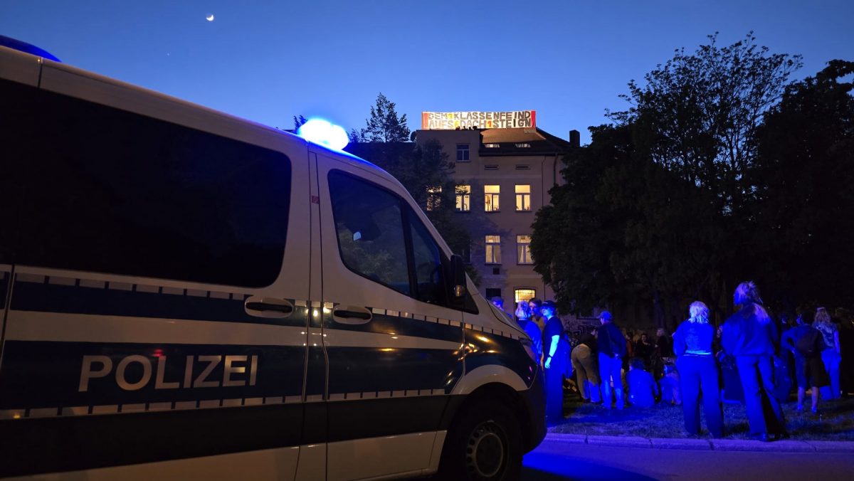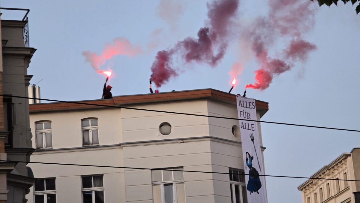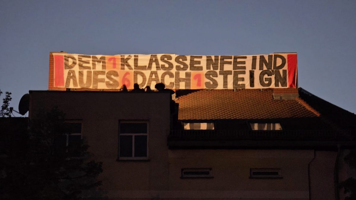 Am Endpunkt der Route, dem August-Bebel-Platz, wurde ein großes Transparent mit der Aufschrift „Dem Klassenfeind auf’s Dach steigen“ entrollt – ebenfalls von einer Dachkante aus. Die Symbolik war eindeutig und unterstrich die militante Rhetorik einiger Demonstrationsteilnehmer.
