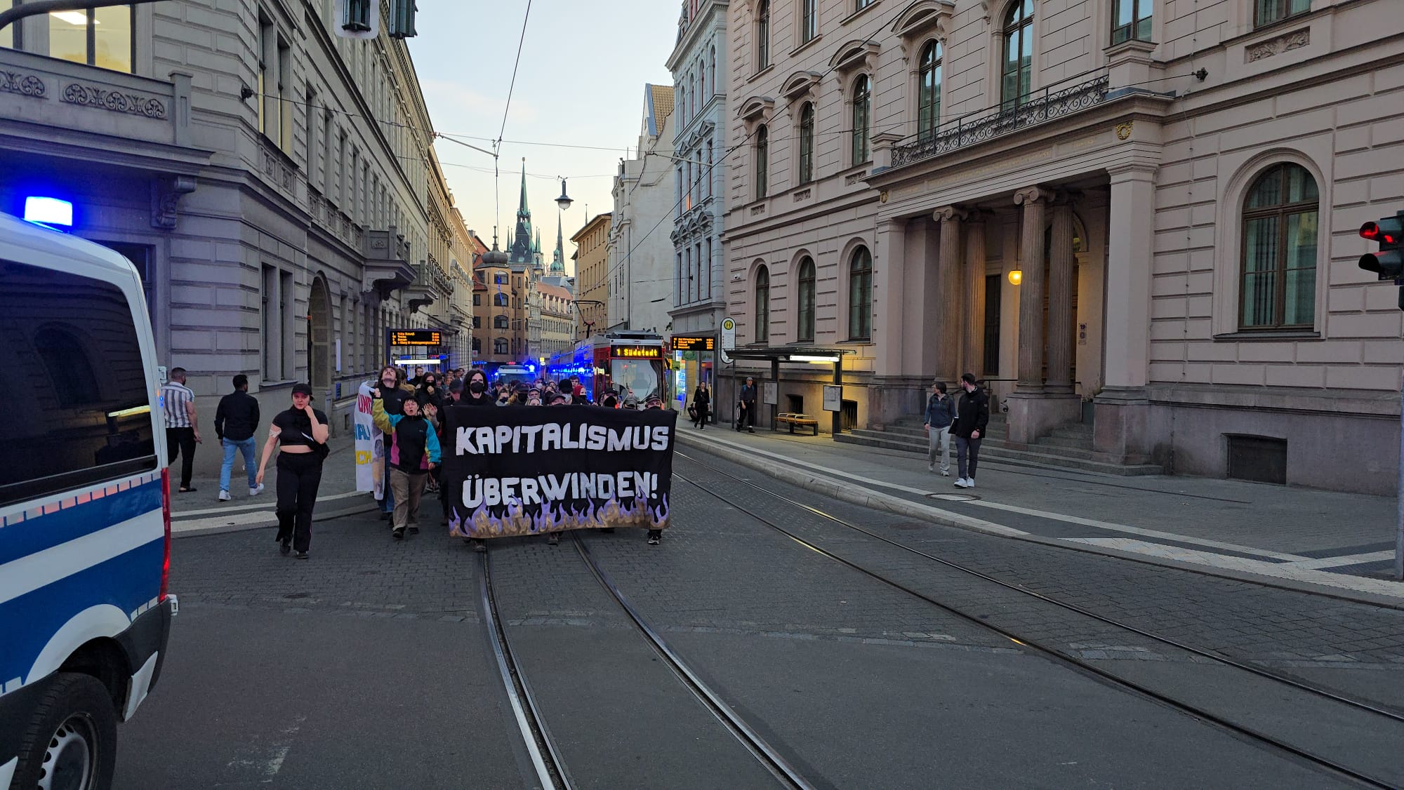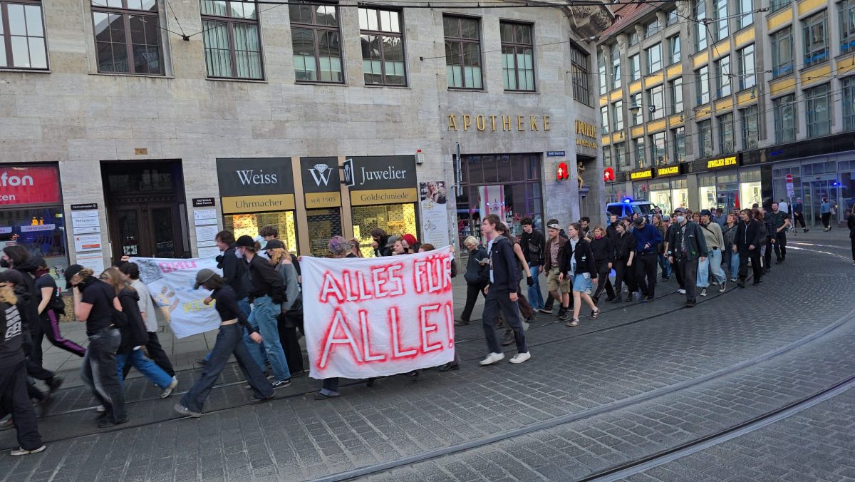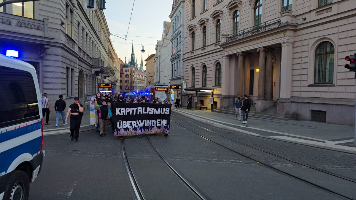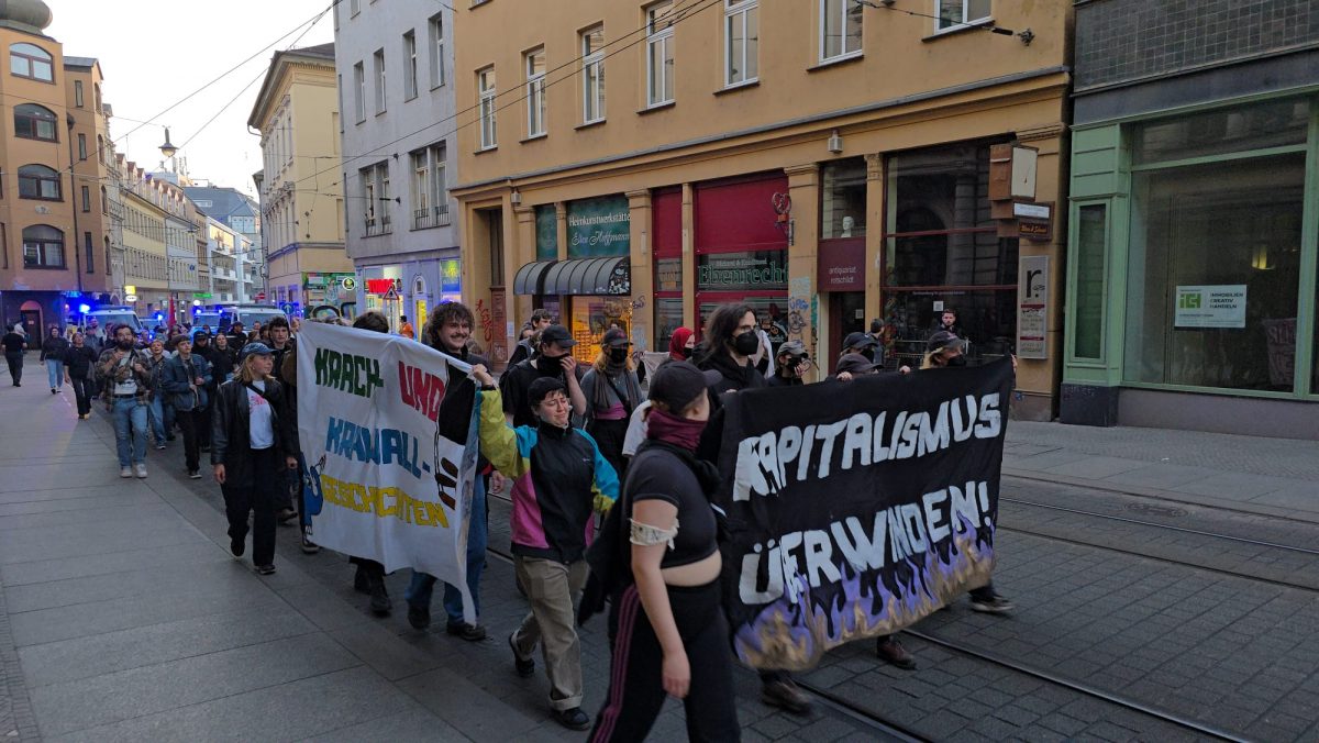 Am Abend des 30. April 2025 haben rund 80 Menschen an einer antikapitalistischen Demonstration in Halle teilgenommen. Unter dem Motto „Alles für alle – sonst gibt’s Krawalle“ zogen die Teilnehmerinnen und Teilnehmer lautstark durch die Innenstadt, begleitet von einem massiven Polizeiaufgebot. Die Demonstration stand im Zeichen des Protests gegen das bestehende Wirtschaftssystem und wurde von kämpferischen Parolen begleitet.