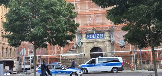 Polizeiautos standen am Wochenende am Hallmarkt in Halle (Saale). Am Eingang des früheren Polizeipräsidiums prangte auch der Schriftzug „Polizei“. Doch die echte Polizei wird hier nicht wieder einziehen, es entstehen Wohnungen. Doch für das Fernsehen ist nochmal polizeiliches Leben hier eingezogen.