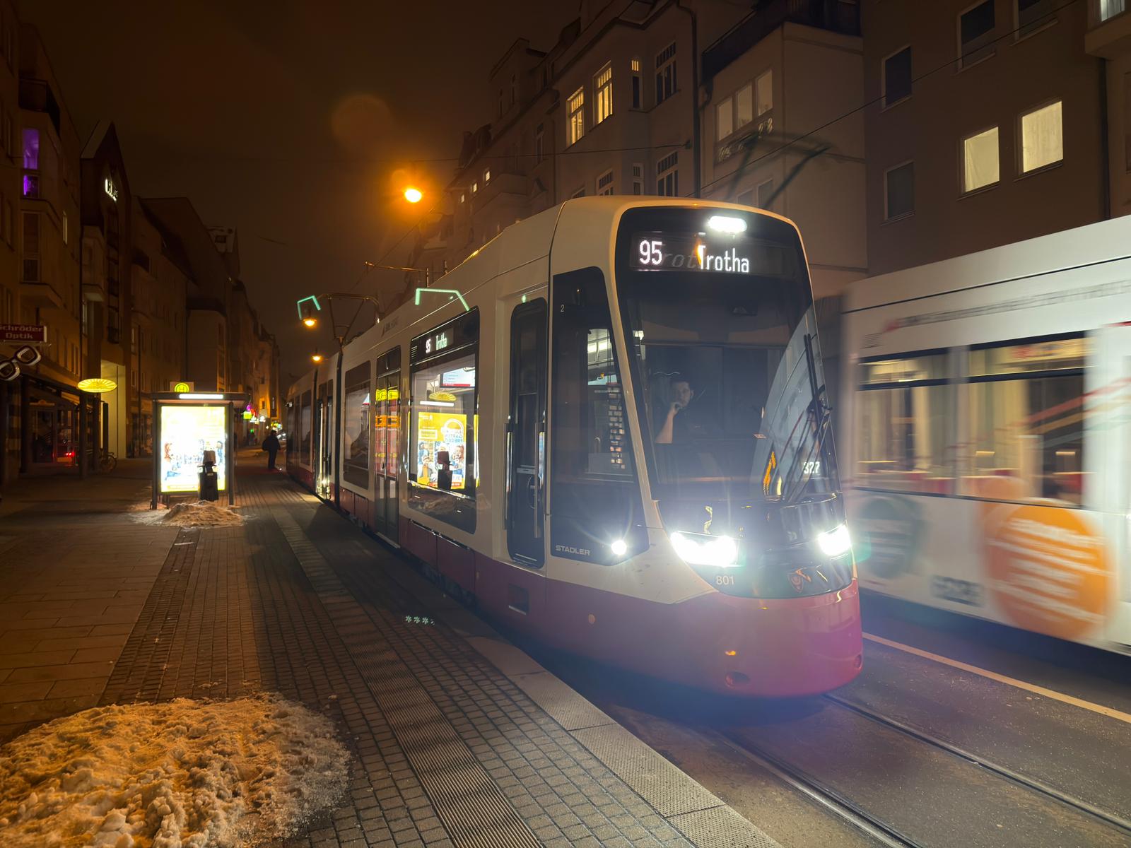 Am Samstagabend gab es eine kleine Premiere im Straßenbahnbetrieb der Halleschen Verkehrs AG (HAVAG). Denn erstmals ging auch eine kurze TINA in den Linienbetrieb. Sie drehte zunächst auf 8/12 und anschließend auf der 95 ihre Runden.