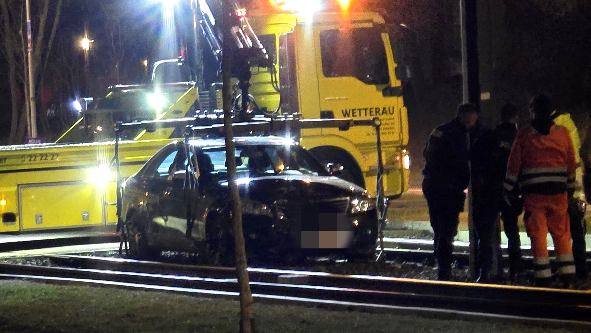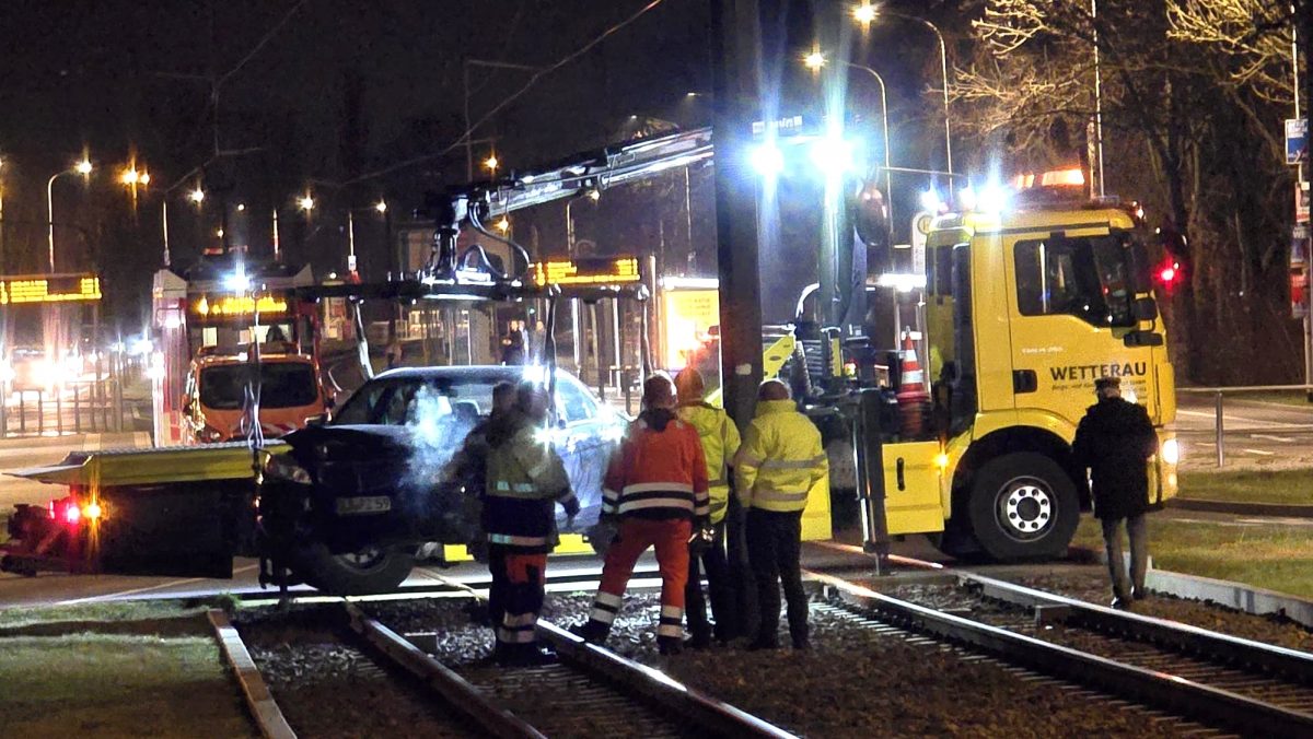 Auto fährt im Gimritzer Damm durch Haltestelle, dann ins Gleisbett der Straßenbahn und gegen Fahrleitungsmast