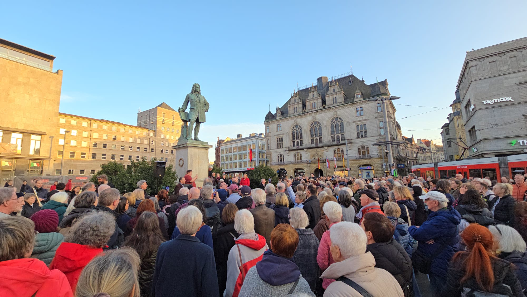 Den traditionellen Auftakt bildet jedoch eine kleine Feierstunde am Händeldenkmal. Dort wurde gemeinsam gesungen. Eröffnet wurde die Feier mit der „Halle-Hymne“ – „An der Saale hellem Strande“. Für besondere Stimmung sorgte das Ensemble Vocal Interlude aus Halles Partnerstadt Grenoble. Anlässlich der 50-jährigen Städtepartnerschaft weilt der Chor derzeit in Halle und stimmte den französischen Klassiker „Aux Champs-Élysées“ an. Aus Irland war „Oh Danny Boy“ zu hören. Auch der Stadtsingechor trat auf.