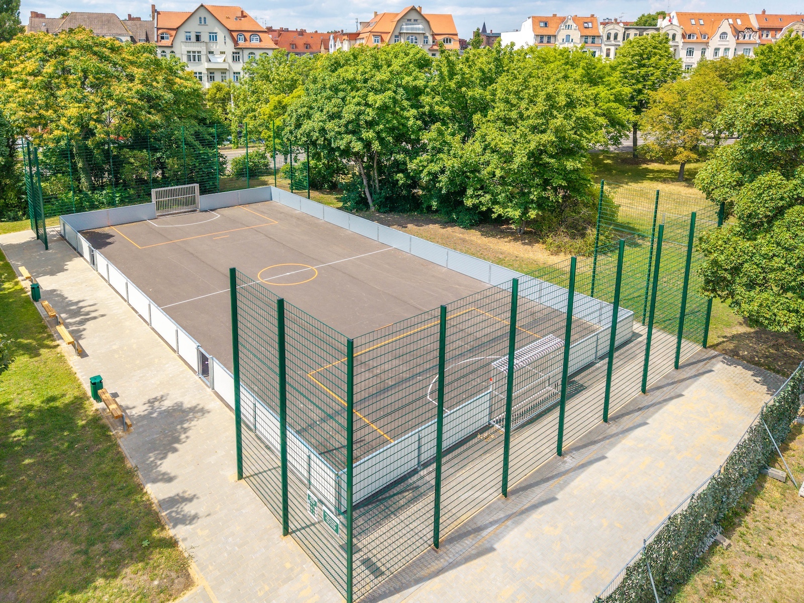Die Stadt hat mit dem kombinierten Bolz- und Bikepolo-Platz ein völlig neues Freizeitangebot für ältere Kinder und Jugendliche geschaffen. Die Anlage soll den Bedarf an zeitgemäßen Outdoor-Aktivitäten vor allem für das Paulus- und im Medizinerviertel abdecken. 349.000 Euro hat die Kommune in die neue Anlage investiert, finanziert aus Eigenmitteln und dem Förderprogramm „Stadtumbau Ost“ mit einer Förderquote von 67 Prozent.