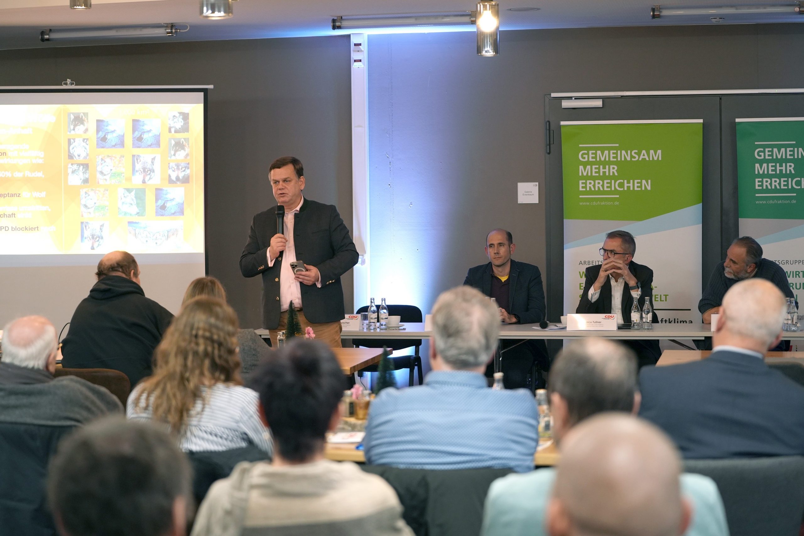 Eröffnet wurde der Abend mit Impulsvorträgen von Michael Unger vom Wolfskompetenzzentrum Iden und vom jagd- und wolfspolitischen Sprecher der CDU-Fraktion, Alexander Räuscher. „Grundsätzlich setzen wir uns für ein sinnvolles Wolfsmanagement ein. Mein Vorschlag ist das französische bzw. schwedische Modell: ein Wolf pro 1000 m2. Die baldige Aufnahme des Wolfes in das Landesjagdgesetz ist wichtig, um ein praktikables und faires Wolfsmanagement zu schaffen.“, so Räuscher.