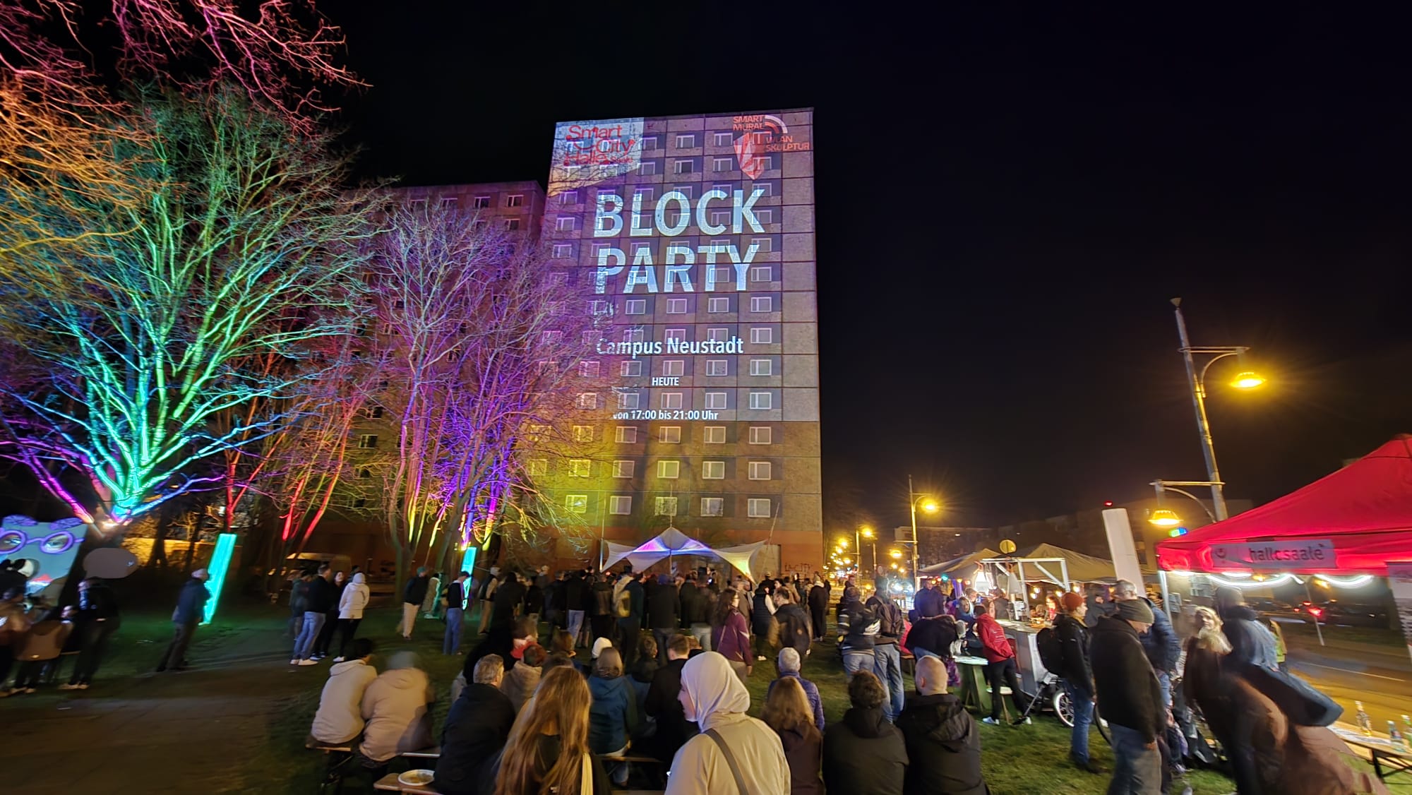 Im kommenden Jahr soll das ehemalige Studentenwohnheim in der Richard-Paulick-Straße in Halle-Neustadt abgerissen werden. Hier soll der Bildungscampus Neustadt entstehen. Am Freitagabend wurde das Gebäude aber noch einmal in Szene gesetzt. Denn hier fand die „Blockparty“ statt. Es war die zweite, die im Rahmen von Smart City organisiert wurde.