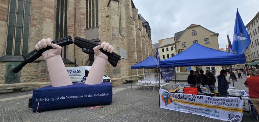 Direkt daneben: ein großes Plakat mit politischer Botschaft. In markanten Buchstaben steht dort: „Wehr dich gegen die Wehrpflicht – Für unsere Zukunft. Gegen Krieg und Aufrüstung.“