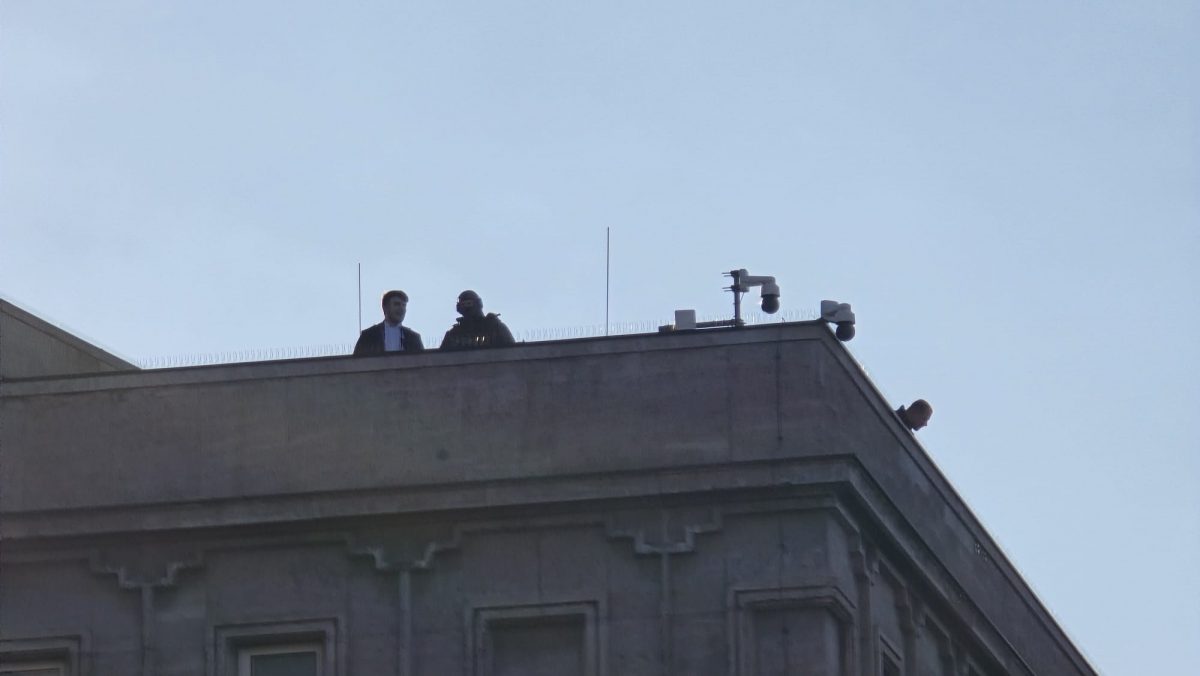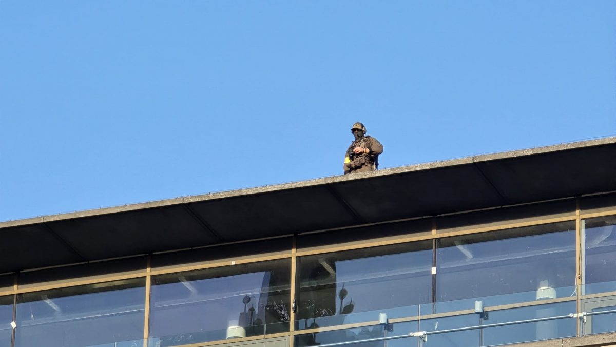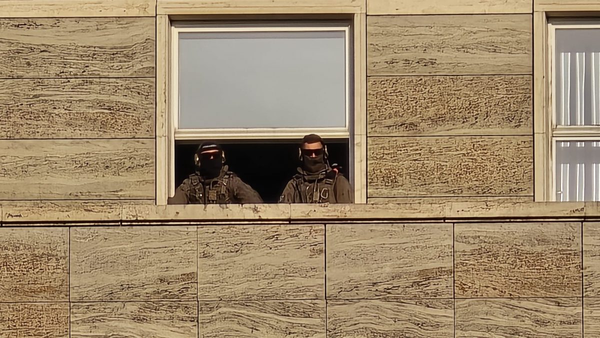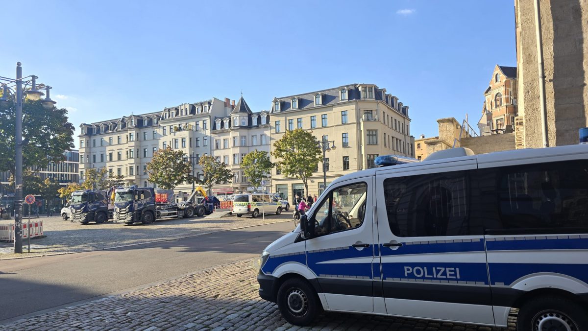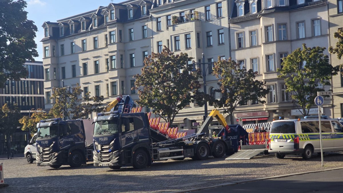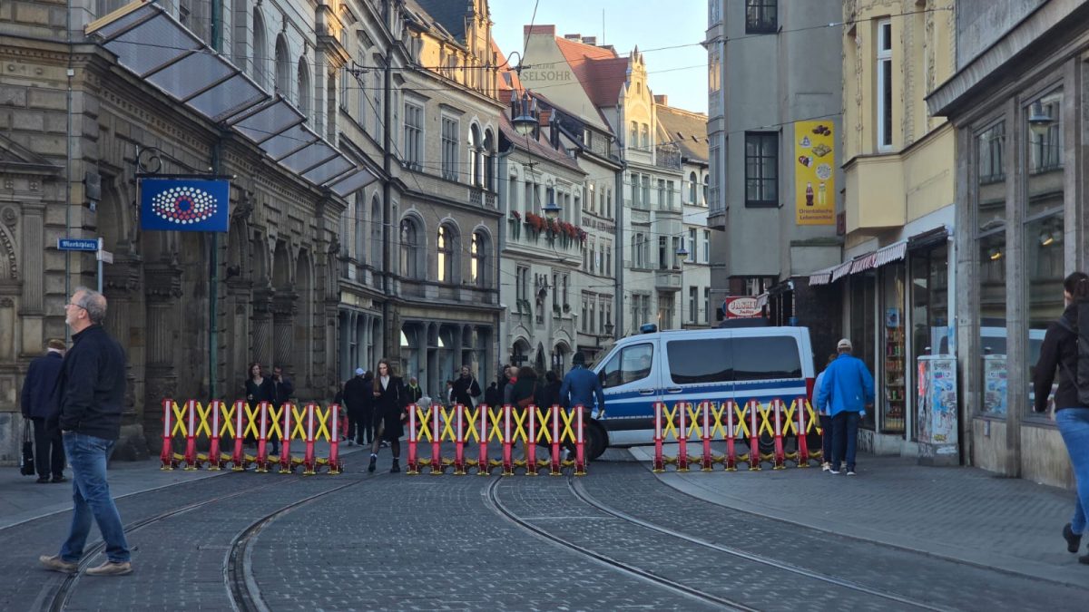 Schon ab halb vier am Freitagnachmittag verstärkte sich das Polizeiaufgebot auf und rund um den Marktplatz, während auf der Bühne der Chor der Singschule für musikalische Unterhaltung sorgte. Ab 17 Uhr wurde der Platz für zweieinhalb Stunden für Straßenbahnen gesperrt, Zufahrtssperren wurden errichtet und Scharfschützen postierten sich auf Dächern umliegender Häuser. Sogar die städtische Webcam wurde mit dem Hinweis “Wartungsarbeiten” abgeschaltet und der Blechbläser auf den Hausmannstürmen musste seine musikalischen Einlagen neben der Straßenbahnhaltestelle fortsetzen.