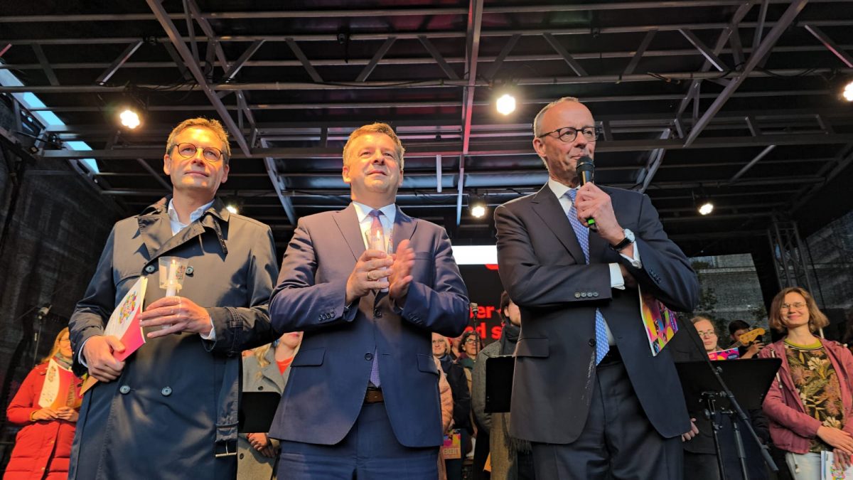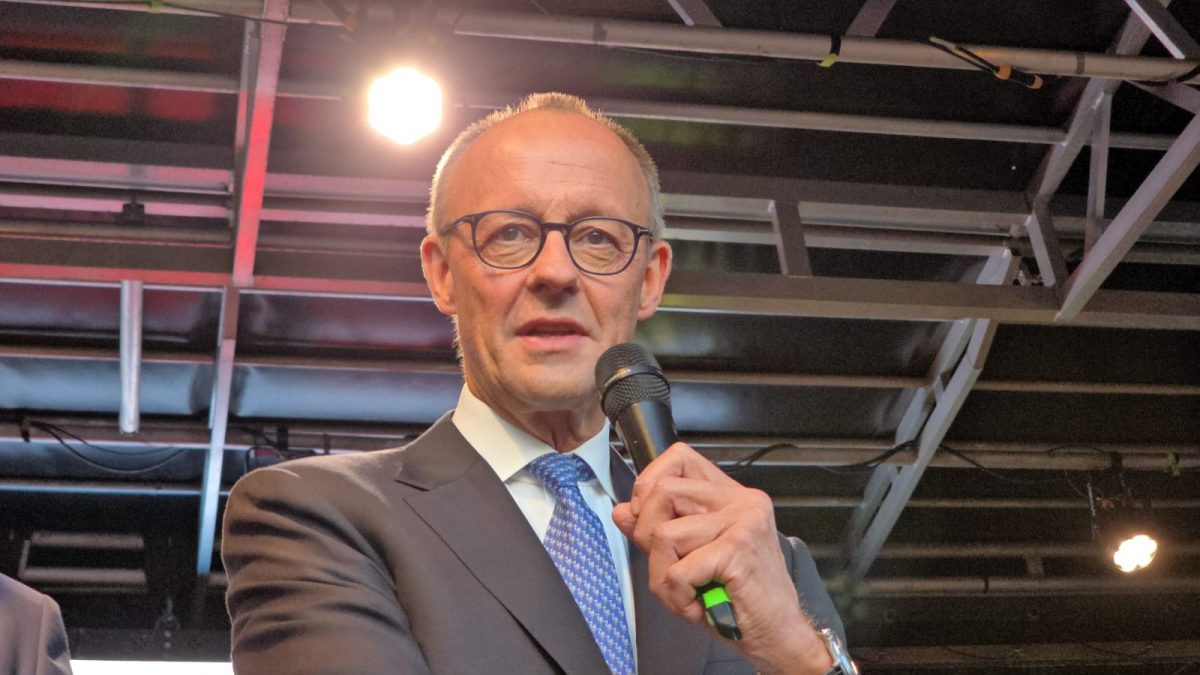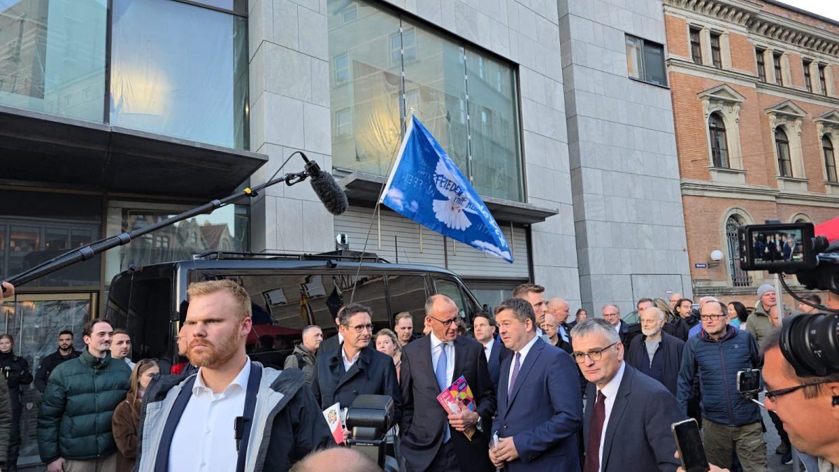 Trotz der Sicherheitsvorkehrungen gab es bis auf die Fahrzeugsperren keine Beschränkungen: Jeder konnte den Marktplatz betreten. Dies spiegelte sich auch in der Publikumsreaktion wider, als Merz die Bühne betrat: Einige Buh-, Pfui- und “Lügner”-Rufe waren zu vernehmen, die jedoch im Applaus der anderen Gäste untergingen. Am Rande der Veranstaltung waren dennoch Zeichen des Protests sichtbar: Eine Fahne mit einer Friedensflagge wurde geschwenkt, eine Frau trug ein T-Shirt mit der Aufschrift “Friedenssüchtig”, und auf dem Pflaster war der Spruch “Das Politbüro zu kritisieren ist immer noch verboten” zu lesen.