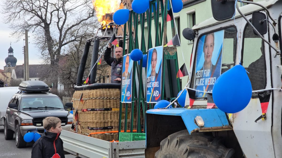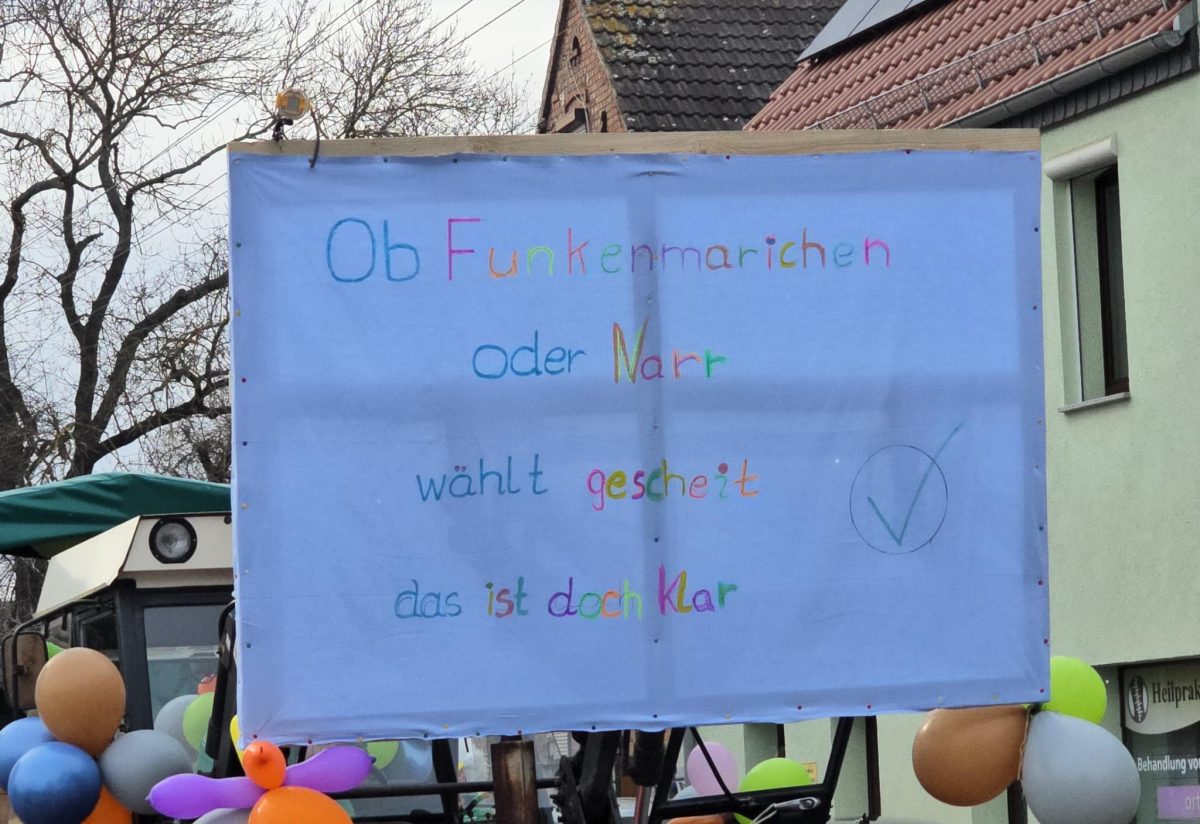“Ob Funkenmarichen oder Narr, wählt gescheit, das ist doch klar”, stand noch neutral auf einem Schild. An einem Galgen baumelte eine Ampel. “Wir haben es geschafft. Morgen sind se weg”, freuten sich die Teutschenthaler Teufel. Und Ballonpilot Uwe Stierand machte mit mehreren Plakaten Werbung für die AfD.