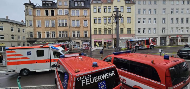 Die Große Steinstraße in Halle (Saale) ist immer noch gesperrt. Die Löscharbeiten am Eckhaus Ludwig-Stur-Straße laufen weiterhin. Am Mittwochvormittag waren Glutnester aufgeflammt. Am Dienstagabend hatte das Gebäude lichterloh in Flammen gestanden.
