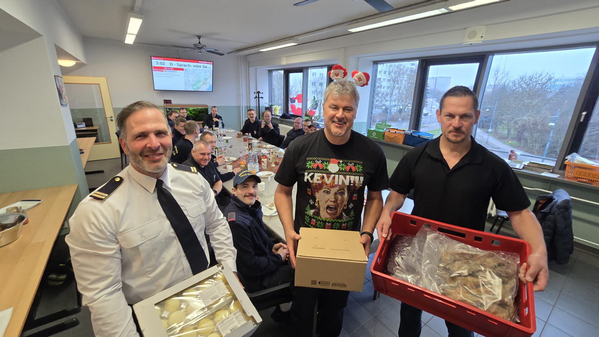 Dankeschön zum Fest: Chefs besuchen Feuerwehr in der Hauptwache zu Weihnachten und überbringen Gänsebraten