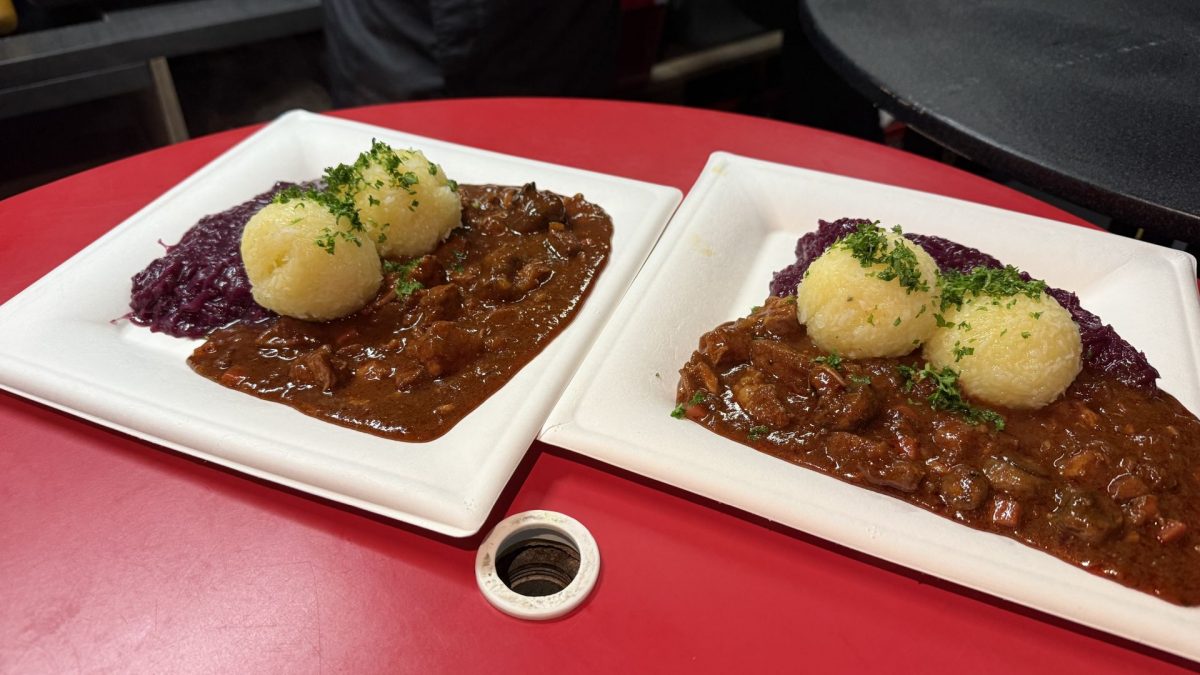 Gulasch, Rotkohl und Klöße
