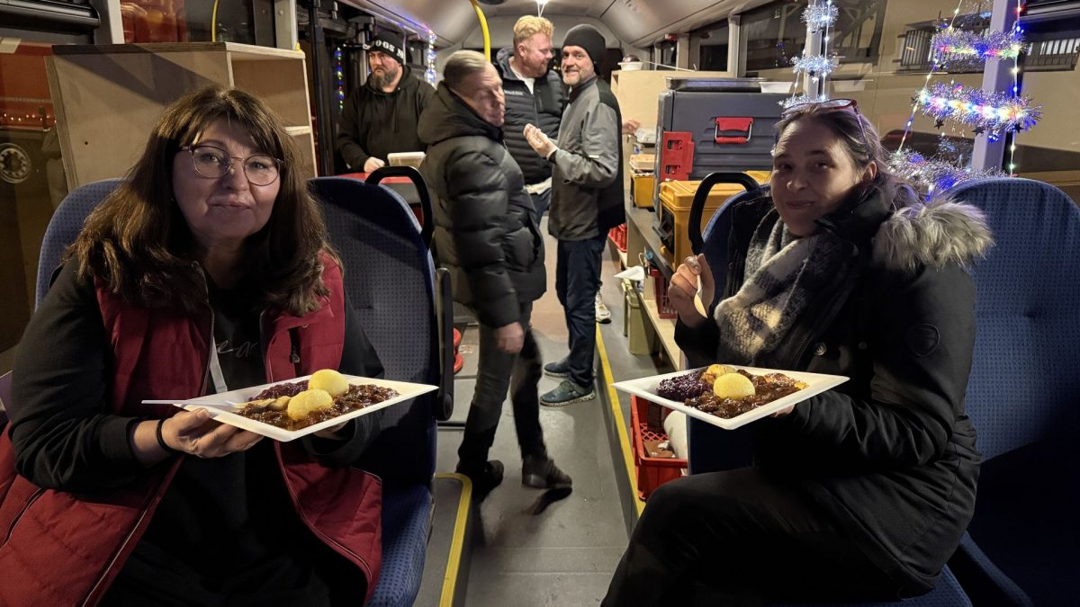 Der Fokus des Konvois lag auch diesmal auf der kulinarischen Versorgung. Insgesamt wurden rund 100 Portionen eines klassischen Weihnachtsmenüs ausgegeben: Zartes Gulasch mit Rotkohl und Klößen sorgte für volle Mägen und glückliche Gesichter. Das Essen wurde in dem zum mobilen Speisesaal umgebauten Auflieger serviert, der den Gästen einen Moment der Ruhe und Würde abseits der Straße bot.