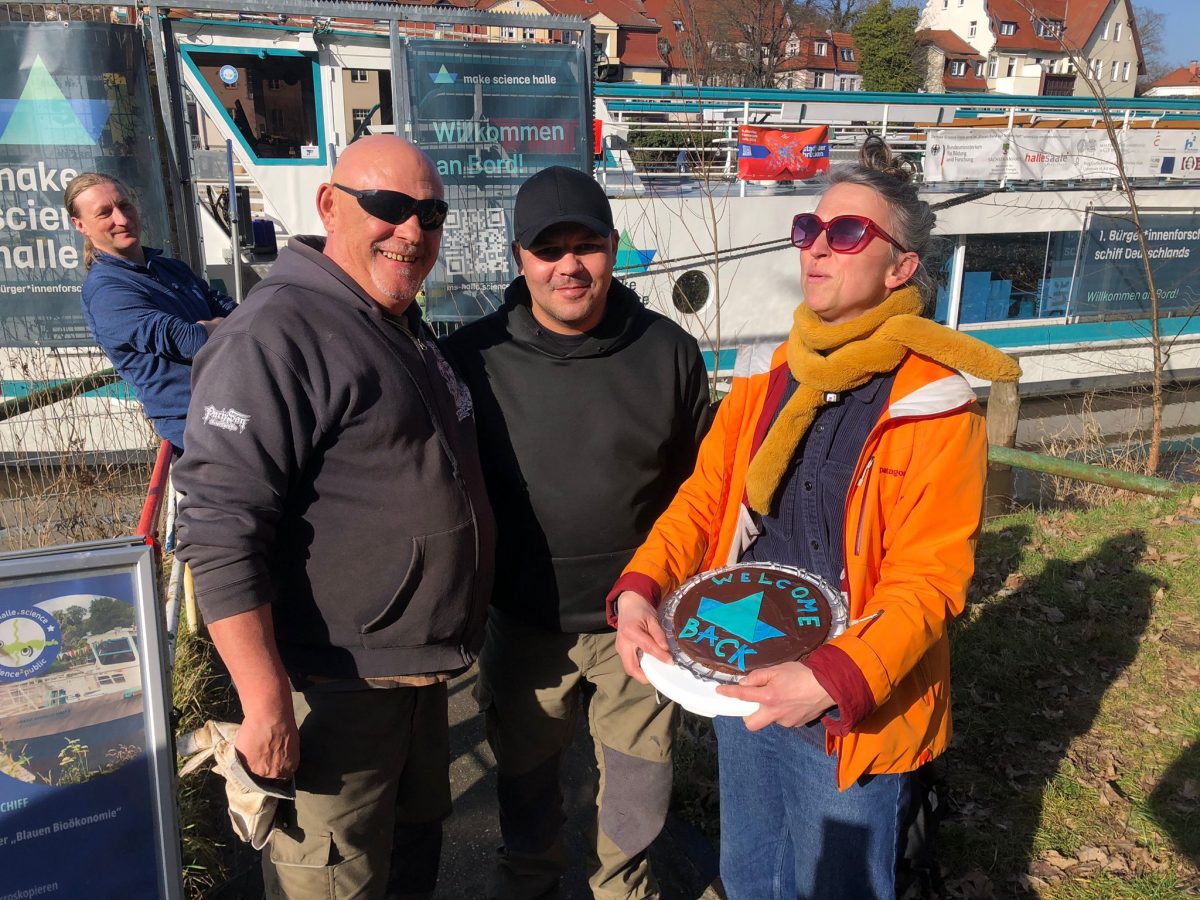 Am Freitagnachmittag war es schließlich so weit: Die „MS Make Science“ kehrte nach Halle zurück und wurde am Ufer von Mitarbeitenden und Ehrenamtlichen herzlich empfangen. Mit der Rückkehr beginnt nun auch wieder der reguläre Betrieb an Bord.