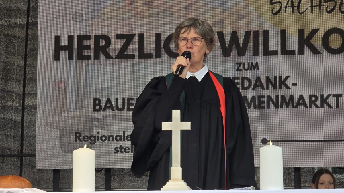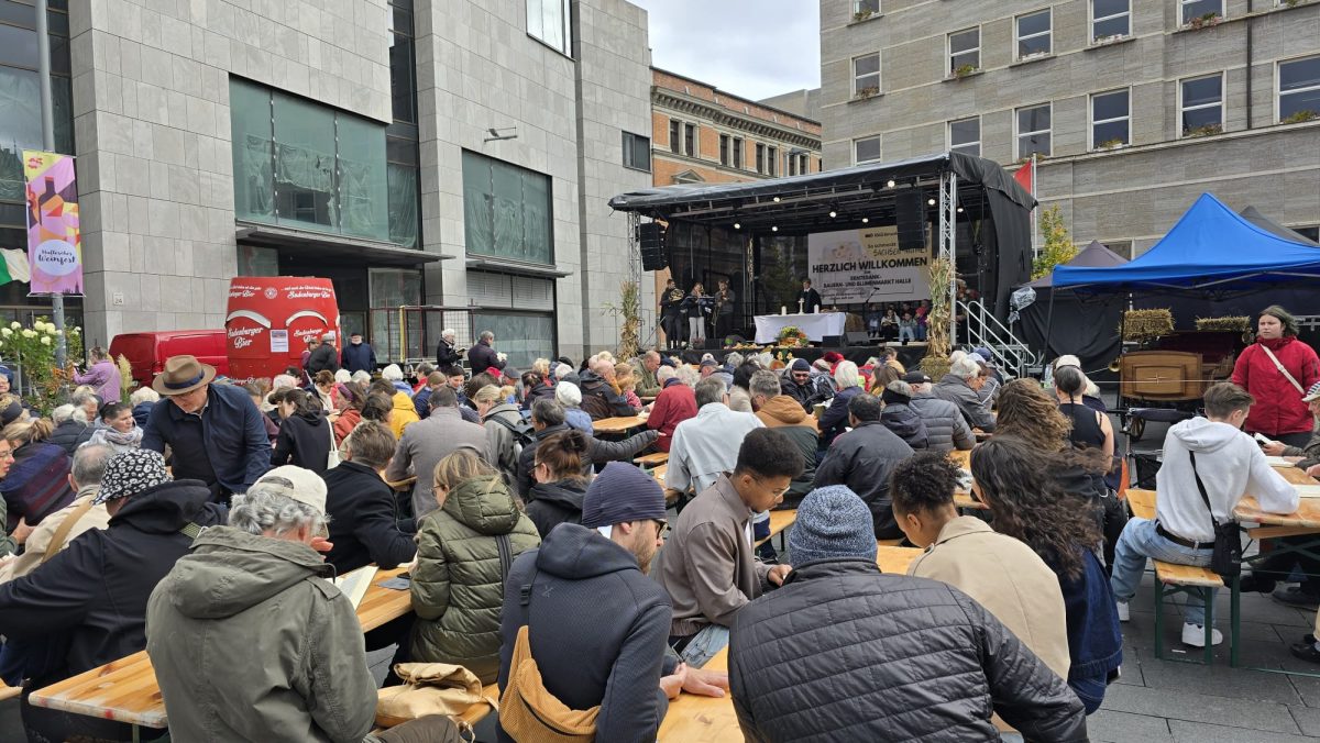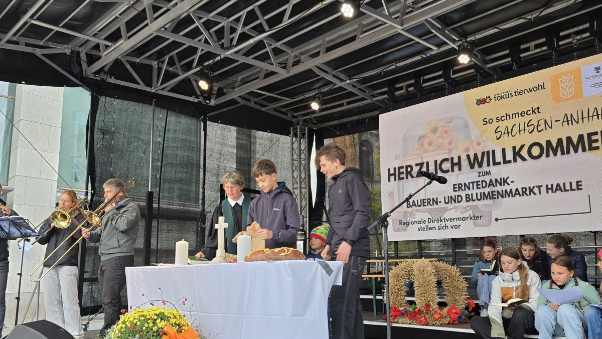 Halle (Saale) – Zum zweiten Mal in Folge hat die Marktkirchengemeinde Halle ihren Erntedank-Gottesdienst unter freiem Himmel auf dem Marktplatz gefeiert – im Herzen der Stadt und mitten im bunten Treiben des Erntedank-, Blumen- und Bauernmarkts. Trotz kühler Temperaturen und böigem Wind versammelten sich rund 250 Gläubige und Neugierige, um gemeinsam zu danken, zu beten und zu feiern.