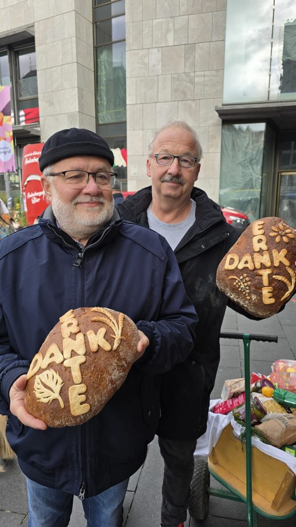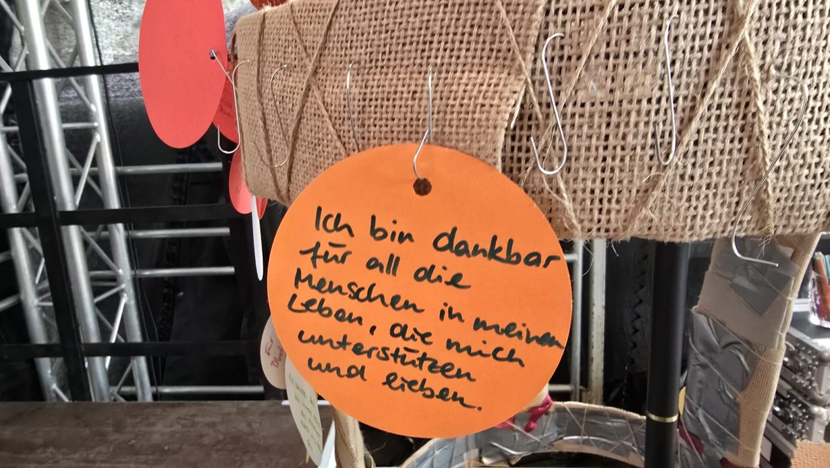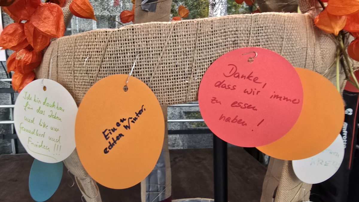 Ein kreatives und stilles Highlight war die „Erntekrone aus Worten“. Besucher waren eingeladen, auf kleinen Zetteln Worte und Wünsche festzuhalten, die sie mit Dankbarkeit verbinden. Diese wurden anschließend zu einer symbolischen Krone zusammengefügt. Die Botschaften reichten von persönlichen Hoffnungen bis zu gesellschaftlichen Anliegen: „Friede für alle Menschen“, „Mehr Achtsamkeit mit Lebensmitteln“, „Gesundheit für meine Familie“ – viele kleine Stimmen, die gemeinsam ein großes Bild ergaben.