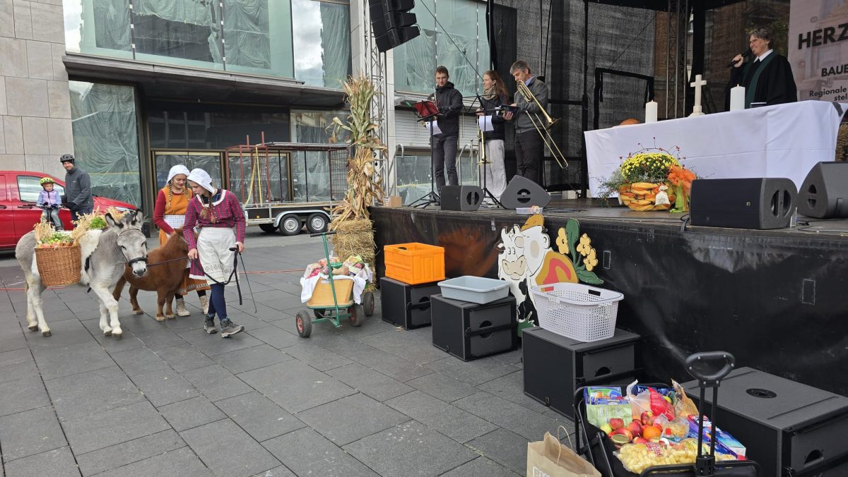 Wie im vergangenen Jahr wurde der Gottesdienst auch genutzt, um an diejenigen zu denken, die nicht genug haben. So wurde erneut die Bahnhofsmission unterstützt. Evangelische Kitas wie „St. Ulrich“, „St. Georgen“ und die „Marktspatzen“ sammelten gemeinsam mit den Händlern des Bauernmarktes Lebensmittelspenden.