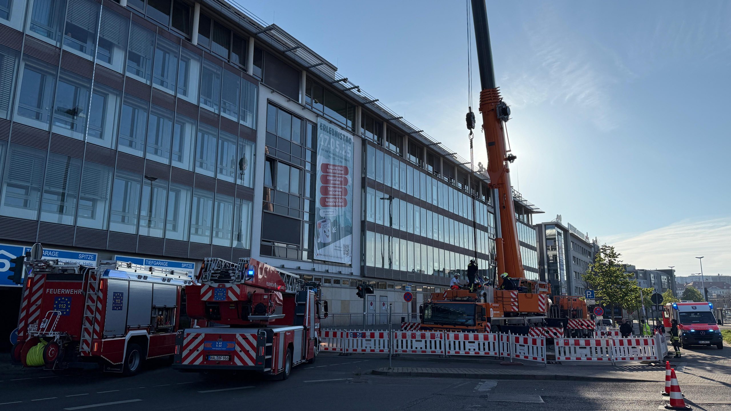 Feuerwehr und Rettungsdienst müssen sich um verletzte Person auf einem Kran vor dem Stadtwerke-Gebäude kümmern