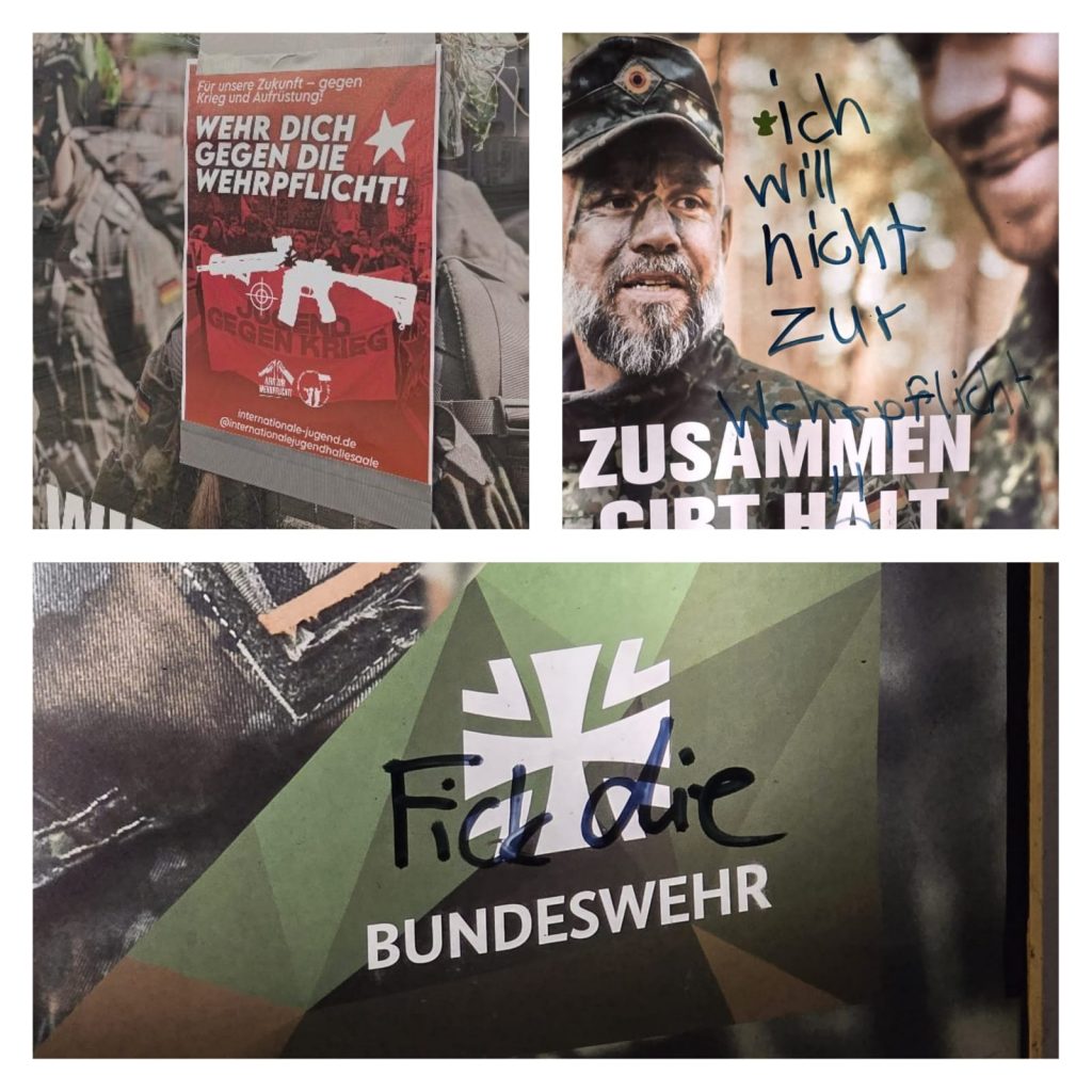 Die geplante Wiedereinführung der Wehrpflicht sorgt auch in Halle (Saale) für hitzige Diskussionen – und zunehmend für Widerstand. Im gesamten Stadtgebiet sind in den letzten Tagen mehrere Werbeplakate der Bundeswehr beschädigt oder überklebt worden. Auf einigen von ihnen finden sich drastische Parolen wie „Fick die Bundeswehr“ oder „Ich will nicht zur Wehrpflicht zurück“. Hinter einem Teil der Aktionen steht teilweise die Organisation Internationale Jugend Sie hat mehrere Plakate mit selbst gestalteten Schildern überklebt, die sich klar gegen die Reaktivierung der Wehrpflicht aussprechen.