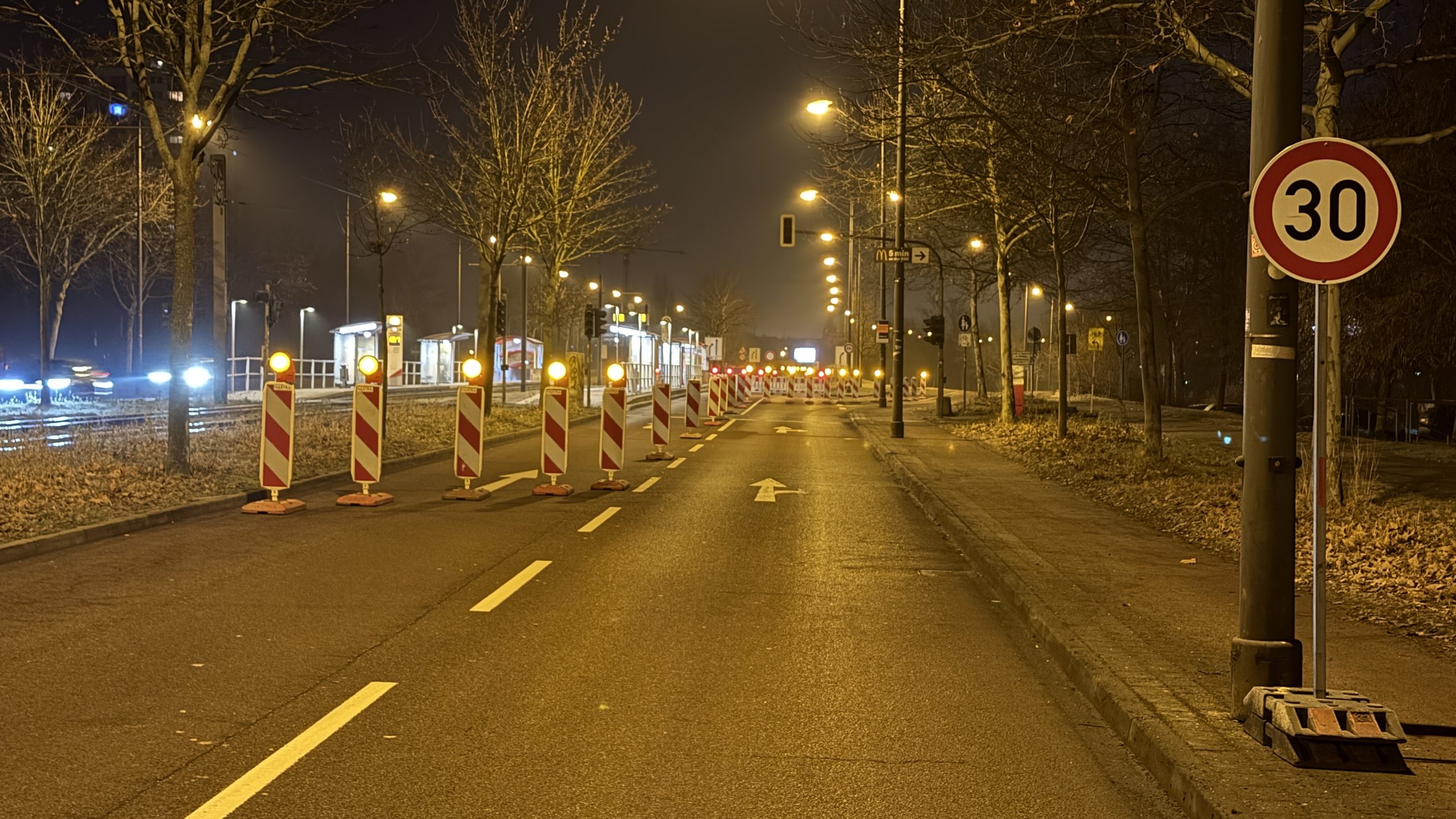 Am Samstagabend gegen 21 Uhr wurden die beiden geradeaus führenden Fahrspuren der Magistrale in Fahrtrichtung Riebeckplatz auf Höhe der Haltestelle Hyazinthenstraße für den Fahrzeugverkehr gesperrt.