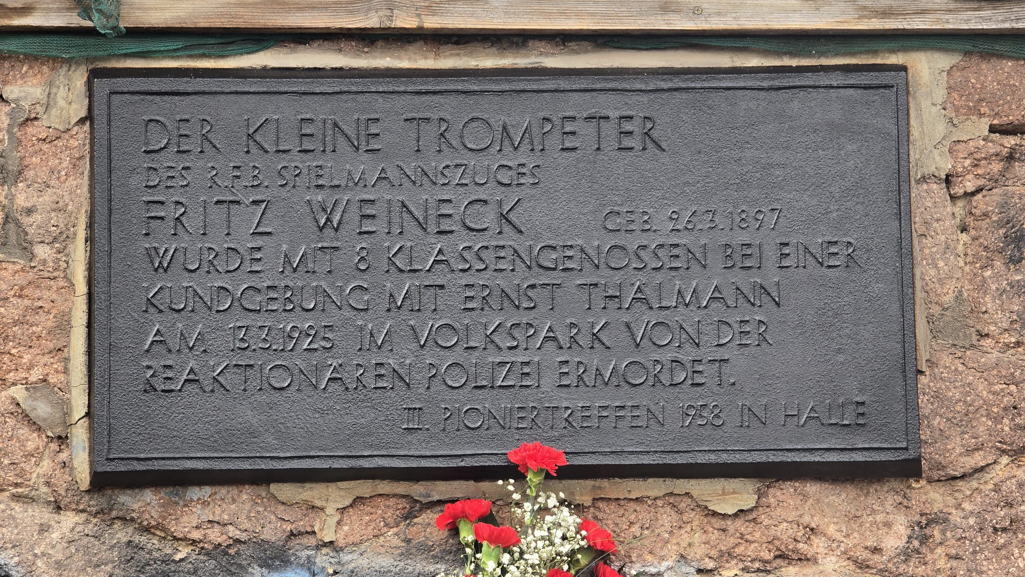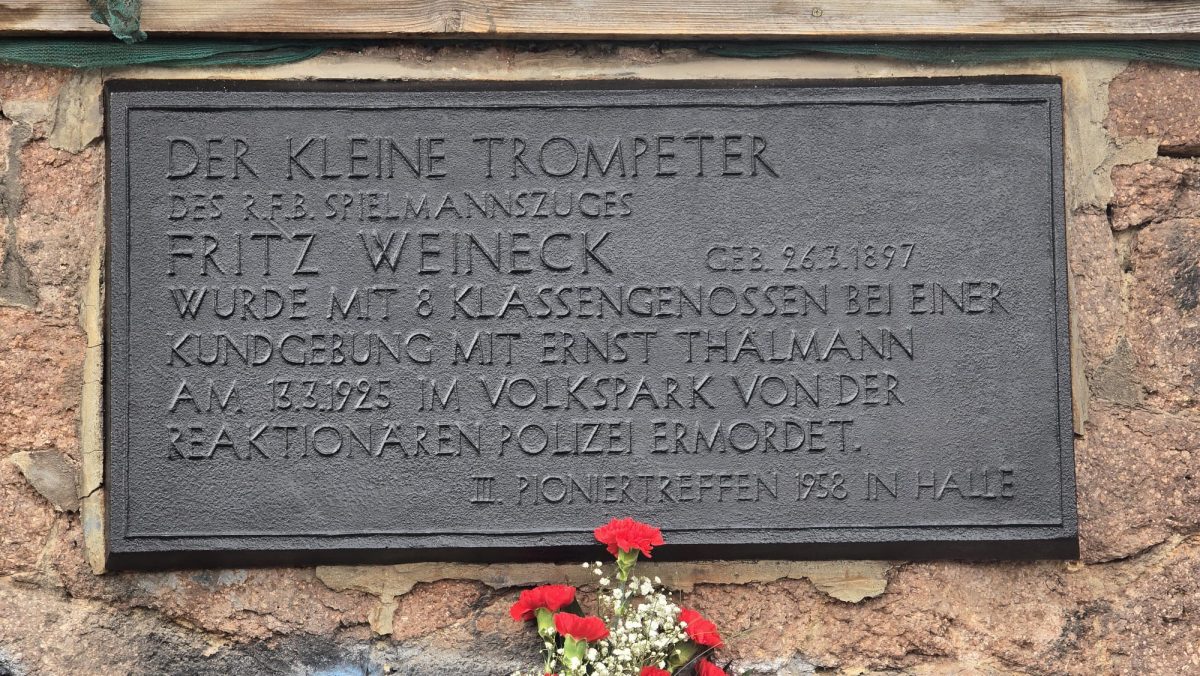 Der 13. März 1925 ging als “Blutfreitag” in die hallesche Stadtgeschichte ein. Eine Wahlkampfveranstaltung im Volkspark, bei der unter anderem Ernst Thälmann sprechen sollte, wurde durch die Schutzpolizei gewaltsam aufgelöst. Zehn Menschen starben, darunter auch Friedrich August Weineck, besser bekannt als Fritz Weineck. Als “Kleiner Trompeter” (Eigentlich war er Hornist im Roten Frontkämpferbund) wurde er später bekannt. Zu DDR-Zeiten war das “Lied vom Kleinen Trompeter” (“Von all unsern Kameraden…”) ein Muss für alle Pioniere. Das heutige Riveufer nannte sich Wieneck-Ufer, dort gab es auch ein Denkmal, dass nach dem Ende der DDR mit Farbe beschmiert wurde im Depot landete. Derzeit ist es im Rahmen einer Ausstellung im Stadtmuseum zu sehen.