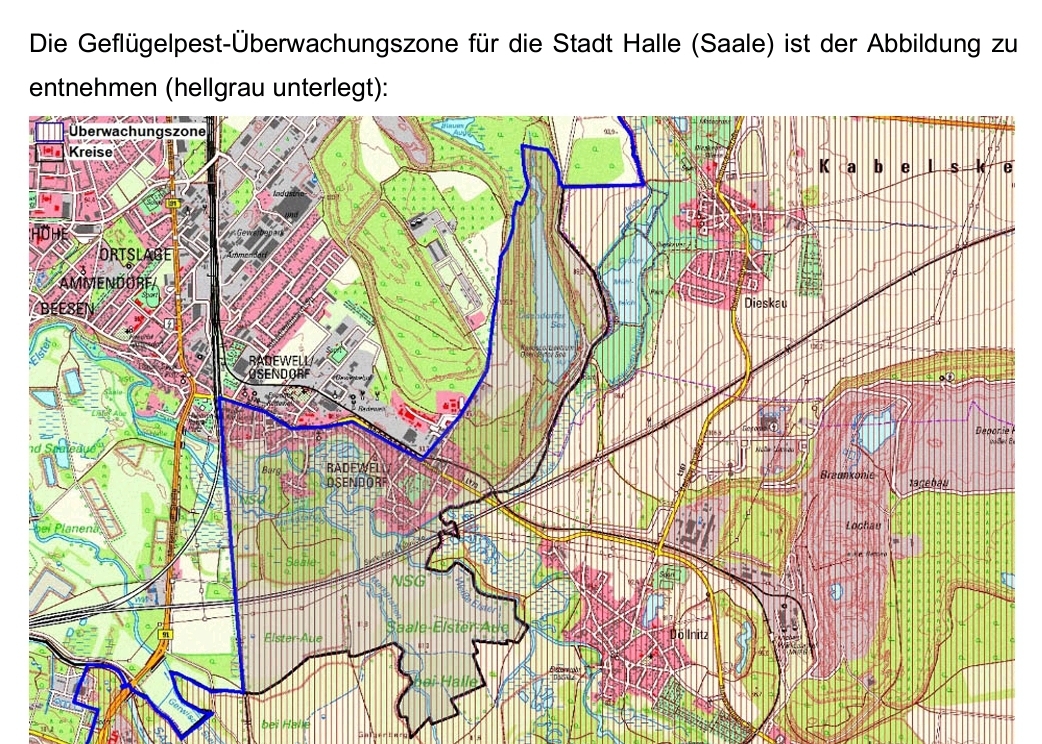 Im Landkreis Saalekreis in der Stadt Leuna (OT Zöschen) wurde am 11. September 2024 der Ausbruch der Geflügelpest (hochpathogene aviäre Influenza – HPAI) vom Subtyp H5N1 amtlich festgestellt. Gemäß EU-Verordnungen und in Verbindung mit der Geflügelpest-Verordnung wurde eine Überwachungszone um den Ausbruchsbetrieb mit einem Radius von mindestens zehn Kilometern eingerichtet.