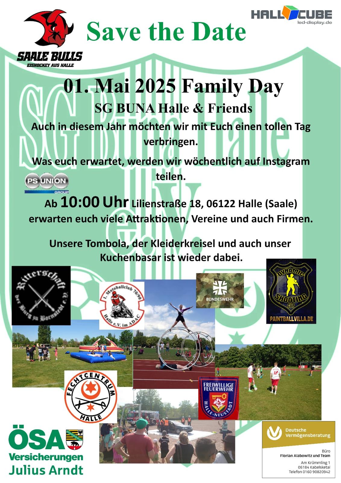Am 1. Mai ist es wieder so weit: Die SG Buna Halle lädt gemeinsam mit befreundeten Vereinen und Organisationen zum 2. Family Day SG Buna Halle & Friends ein. Von 10:00 bis 17:00 Uhr erwartet Familien auf dem Gelände der SG Buna ein buntes Fest mit einem vielseitigen Programm – Mitmachen, Staunen und Erleben ausdrücklich erwünscht!
