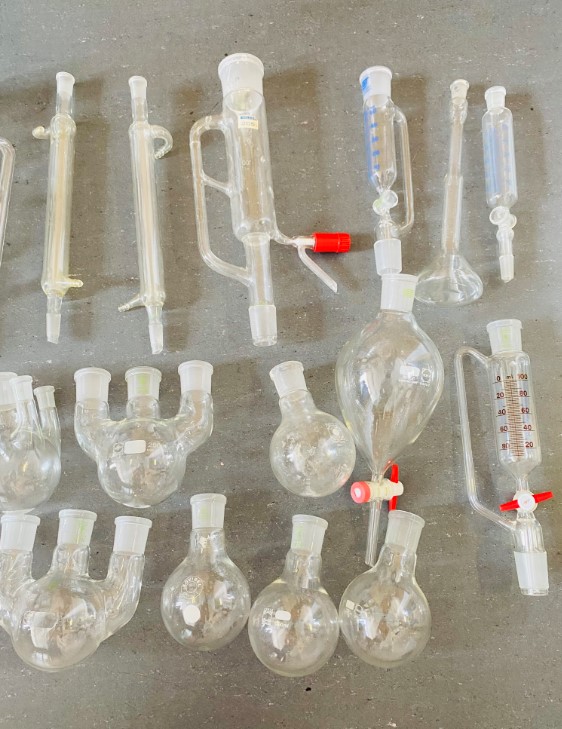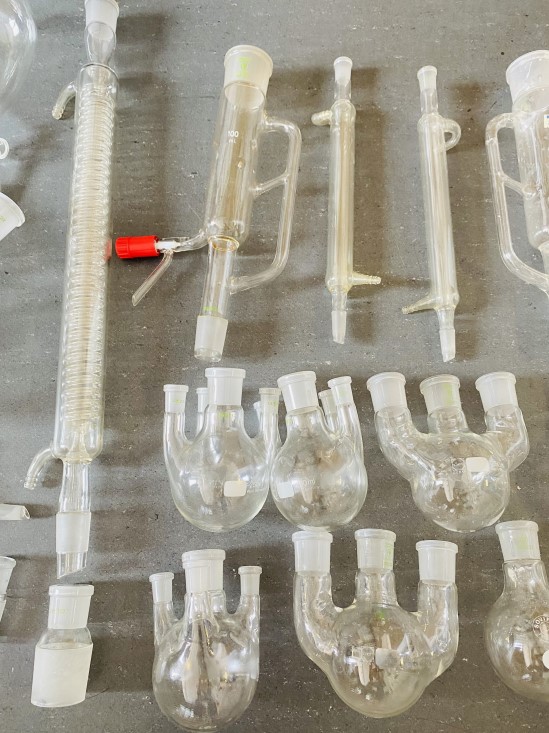 Das sind alles Bauteile für Destillationen bzw Extraktionen. Ich sehe Mehrere Kühler, Thermometer, Flaschen aus Bor-Silikatglas und Verbinder ohne Ende. Und noch einigen anderen Schrapel.