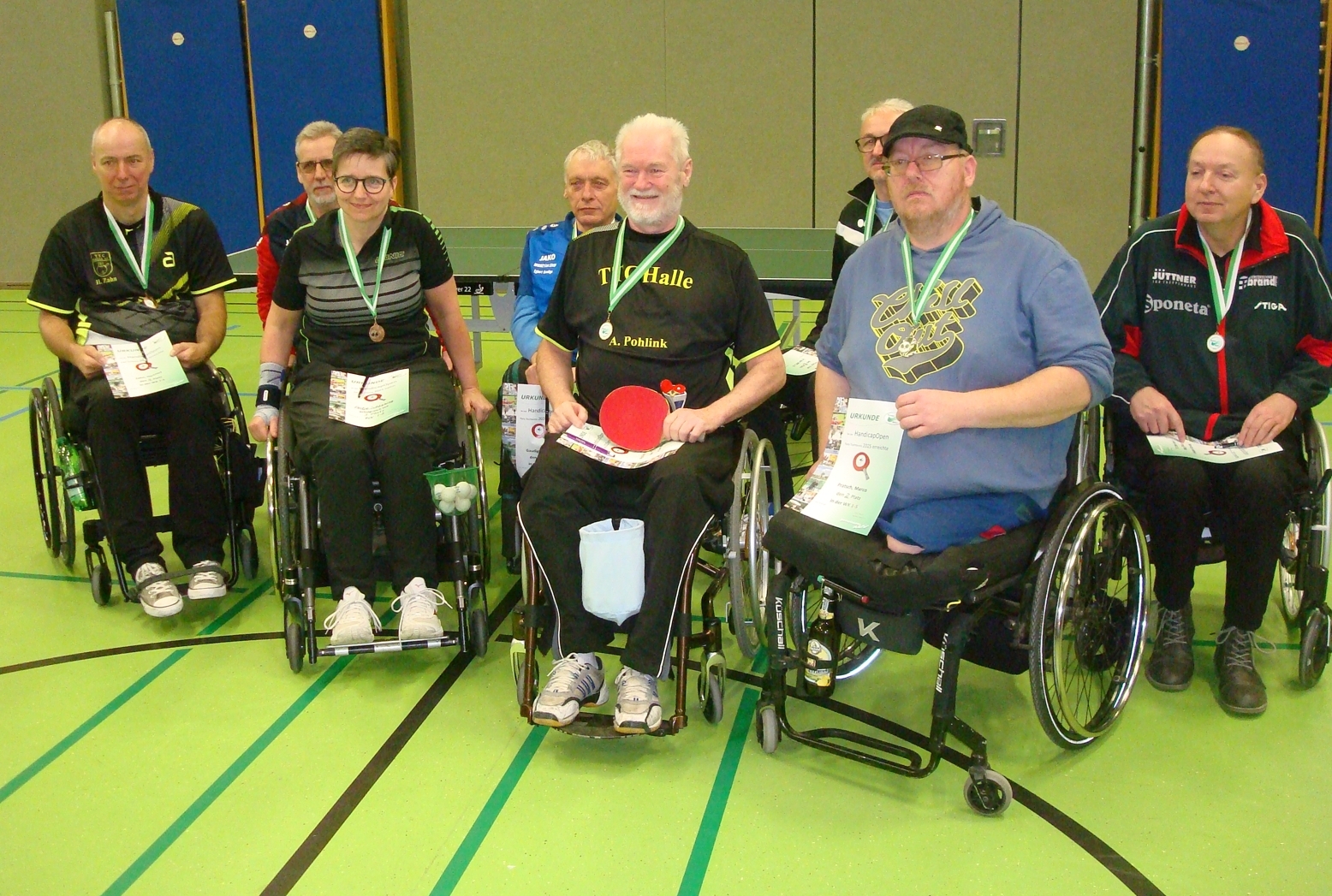 Nach den Gruppen „Jeder gegen Jeden“ ging es im einfachen k.o.-System weiter. Seinen Vorjahrestitel verteidigte erfolgreich Andreas Pohlink vor Marco Pratsch (beide TTC Halle) und Antje Schlesinger (TTV Burgstädt). Auf den Plätzen 4 und 5 folgten Hartmut Zahn (TTC Halle) und Mario Fischer (SV Berlstedt). Alle Plätze waren hart umkämpft. So hart, dass sogar ein Schlägerholz zu Bruch ging und der Wettkampf mit einem mitgebrachten Ersatzschläger beendet werden musste. Alle Teilnehmer erhielten Urkunden. Ausreichend Parkplätze in unmittelbarer Nähe der Sporthalle erfreute die Rollstuhlfahrer sehr. Das erleichterte die barrierefreien Fahrwege enorm. Leider gab es kein Catering, aber alle hatten sich darauf eingestellt und Essen sowie Trinken mitgebracht. Die behindertengerechten Toiletten machten die Location perfekt.
