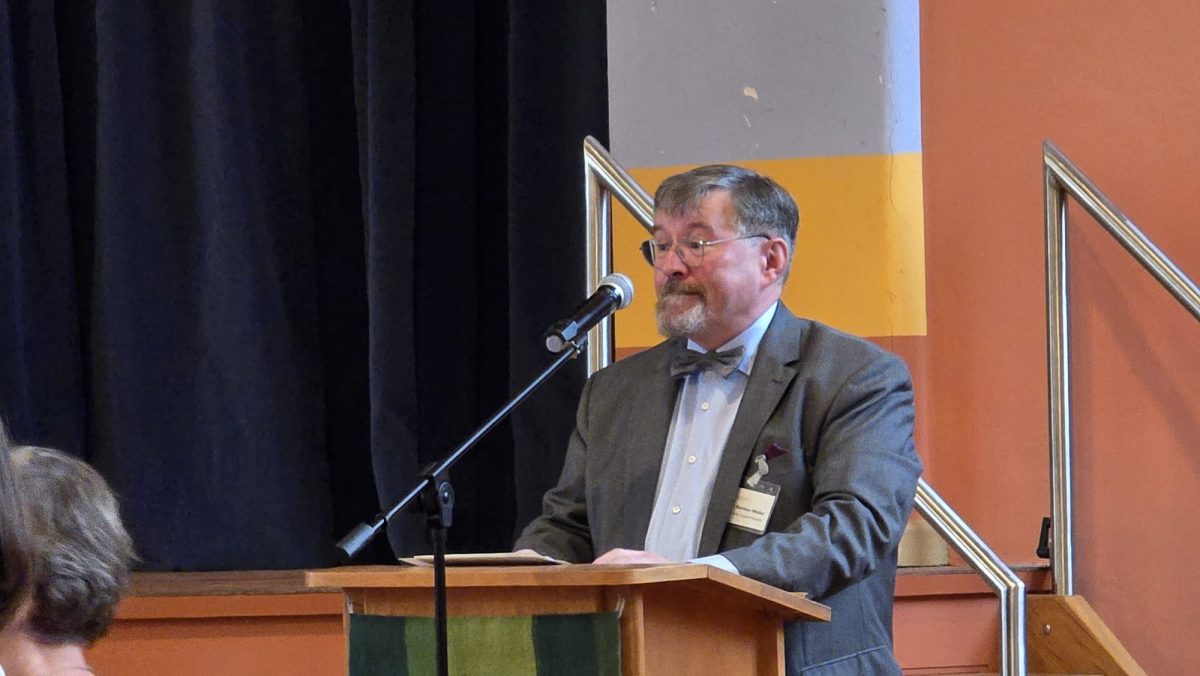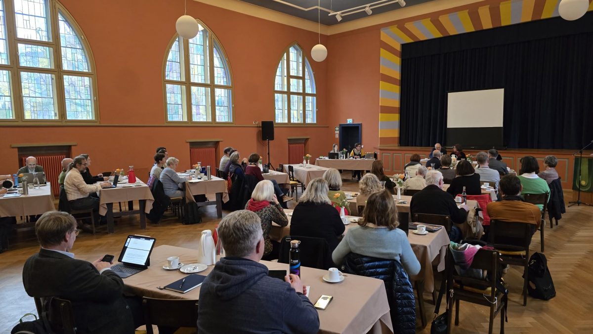 Der amtierende Superintendent Karsten Müller, der die Interimsleitung des Kirchenkreises innehat, führte diesen Gedanken fort und erinnerte daran, dass diese Sitzung das Ende einer Ära markiere. Mit Blick auf den im vergangenen Jahr verabschiedeten Superintendenten Hans-Jürgen Kant und die neue Superintendentin, die ihr Amt erst im kommenden Jahr antreten wird, sagte Müller: „Eine Ära ist zu Ende gegangen, die Wahlperiode unserer Synode wird zu Ende gehen.“ Es sei eine besondere Übergangssituation, in der sich der Kirchenkreis befinde: „Wir befinden uns also als Kirchenkreis zwischen den Zeiten.“ Er verband diese Feststellung mit theologischen Reflexionen über Gottes Zuwendung, die unabhängig von menschlicher Leistung gelte, und warnte davor, die Vergangenheit zu verklären. Im weiteren Verlauf seines Berichts ging Müller auf die Gemeindekirchenratswahlen ein. Mit 21,73 Prozent wurde eine für kirchliche Verhältnisse hohe Wahlbeteiligung erreicht – 4.675 von 21.513 Stimmberechtigten hatten gewählt. 302 Kandidierende wurden gewählt, darunter 168 Frauen, die nun in den Gremien die Mehrheit bilden. Müller deutete dies als Zeichen eines wichtigen Aufbruchs. Ebenso berichtete er von personellen Entwicklungen in der Seelsorge: Neu besetzt wurden die Gefängnisseelsorge in Raßnitz und eine Klinikseelsorgestelle am Bergmannstrost. Für die Bahnhofsmission wird nach einem Weggang eine Findungskommission eingerichtet.