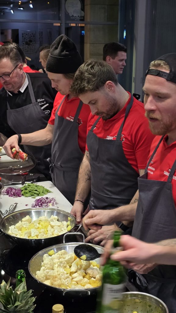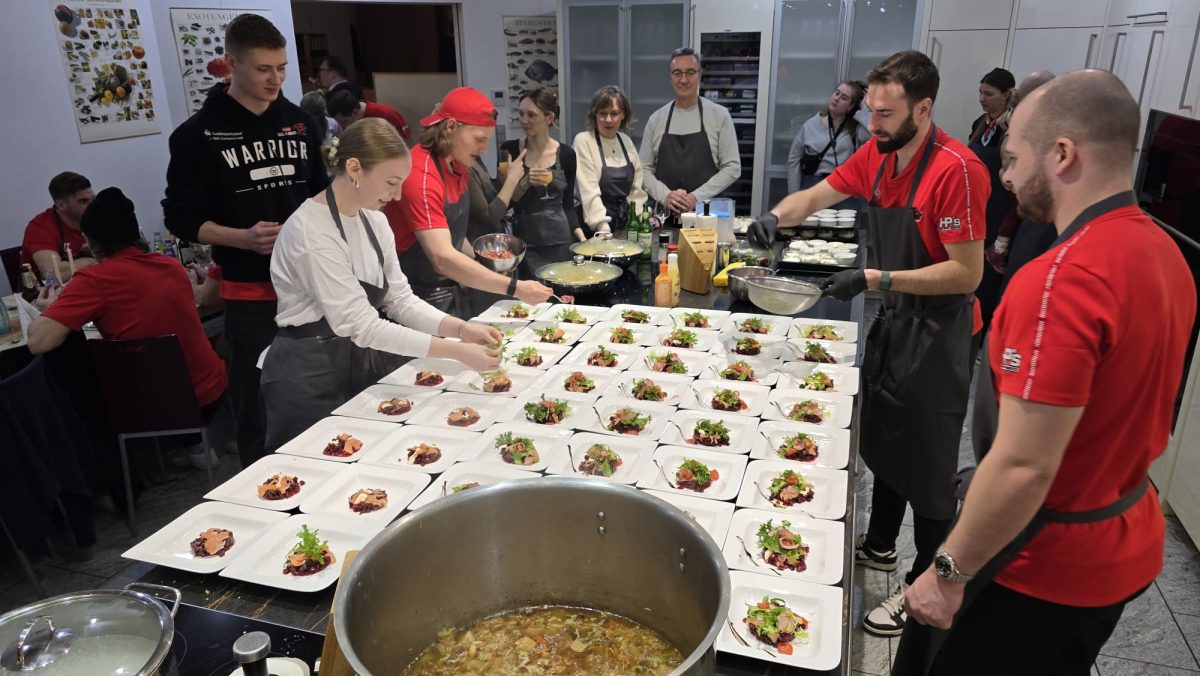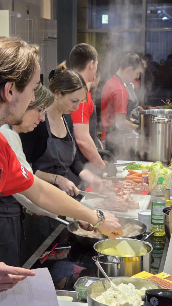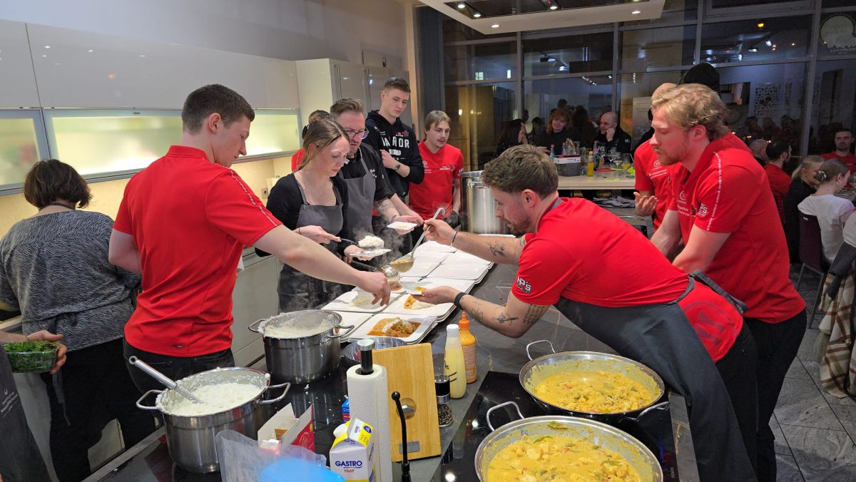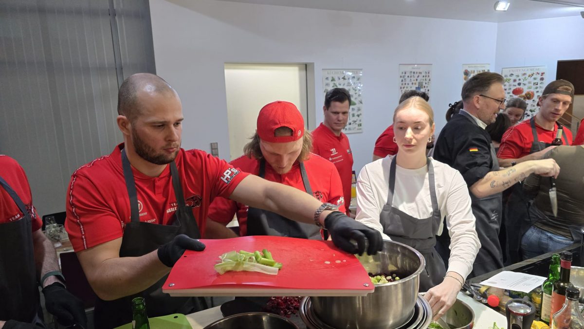 Schon beim Eintreten lag der Duft von frischen Kräutern, gebratenem Fleisch und Röstaromen in der Luft. Statt Helmen trugen die Spieler Schürzen, statt Schlägern hielten sie Küchenmesser in den Händen. Unterstützt wurden sie von ihren Partnerinnen sowie dem Betreuerteam. Gemeinsam wurde geputzt, geschnippelt, pariert und gebraten – mit sichtbarer Konzentration und überraschender Routine. Schnell wurde klar: Der eine oder andere Saale Bull macht nicht nur auf dem Eis, sondern auch am Herd eine ausgesprochen gute Figur.