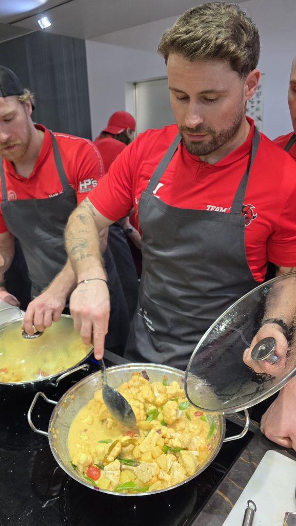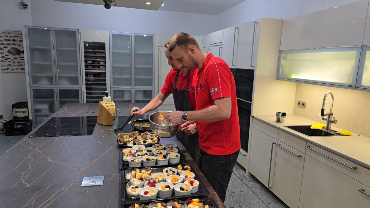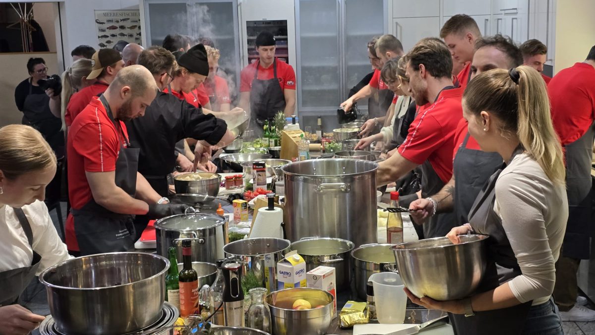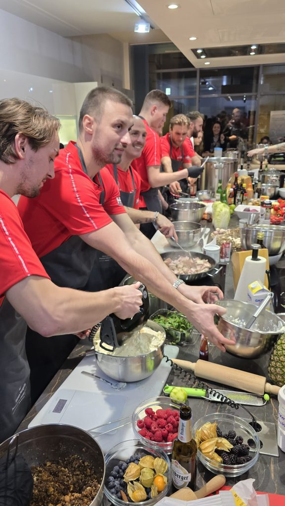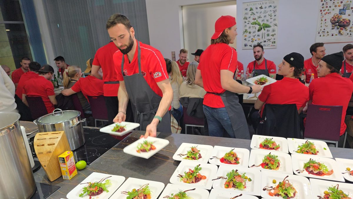 Und genau diese andere Atmosphäre war an diesem Abend deutlich spürbar. Wo sonst taktische Anweisungen und Spielzüge dominieren, wurde gelacht, probiert und gefachsimpelt. Einer würzte nach, der nächste reichte einen Teller weiter, ein dritter kümmerte sich um das perfekte Anrichten. Teamwork, das sonst auf dem Eis über Sieg oder Niederlage entscheidet, zeigte sich hier ganz selbstverständlich zwischen Herd und Arbeitsfläche.