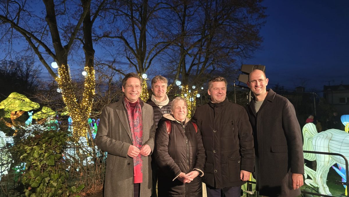 Als sich am Freitagabend die Dämmerung langsam über den Reilsberg senkt, liegt eine besondere Spannung in der Luft: pünktlich zum Einbruch der Dunkelhei erstrahlen nach einem Druck auf den roten Buzzer die Halplus Magischen Lichterwelten 2025/26 in vollem Glanz. 15.000 Lichter bringen den halleschen Bergzoo zum Leuchten. Gemeinsam geben sie das Signal: Sven Schulze, Minister für Wirtschaft, Tourismus, Landwirtschaft und Forsten des Landes Sachsen-Anhalt, Halles Oberbürgermeister Dr. Alexander Vogt, die Beigeordnete und Aufsichtsratsvorsitzende des Zoos Katharina Brederlow, Stadtwerkechef Matthias Lux sowie Zoodirektor Dr. Dennis Müller drücken geschlossen den roten Buzzer. Ein kurzer Augenblick – dann flammen Drachen auf, leuchten Meereswesen, glimmen Zauberstäbe und tauchen Elfenpfade in schimmernde Farben.