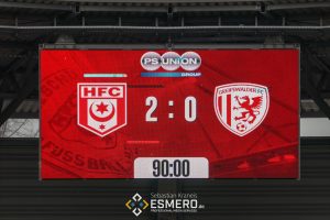 Aufstellung HFC: Müller – Halili, Schmedemann, Zaruba, Landgraf – Hauptmann (65. Hartmann), Kulke (60. Elezi), Wosz (46. Damelang), Löhmannsröben (90. Kastull), Stierlin – Fakhro (75. Baro)