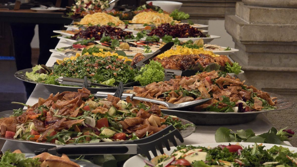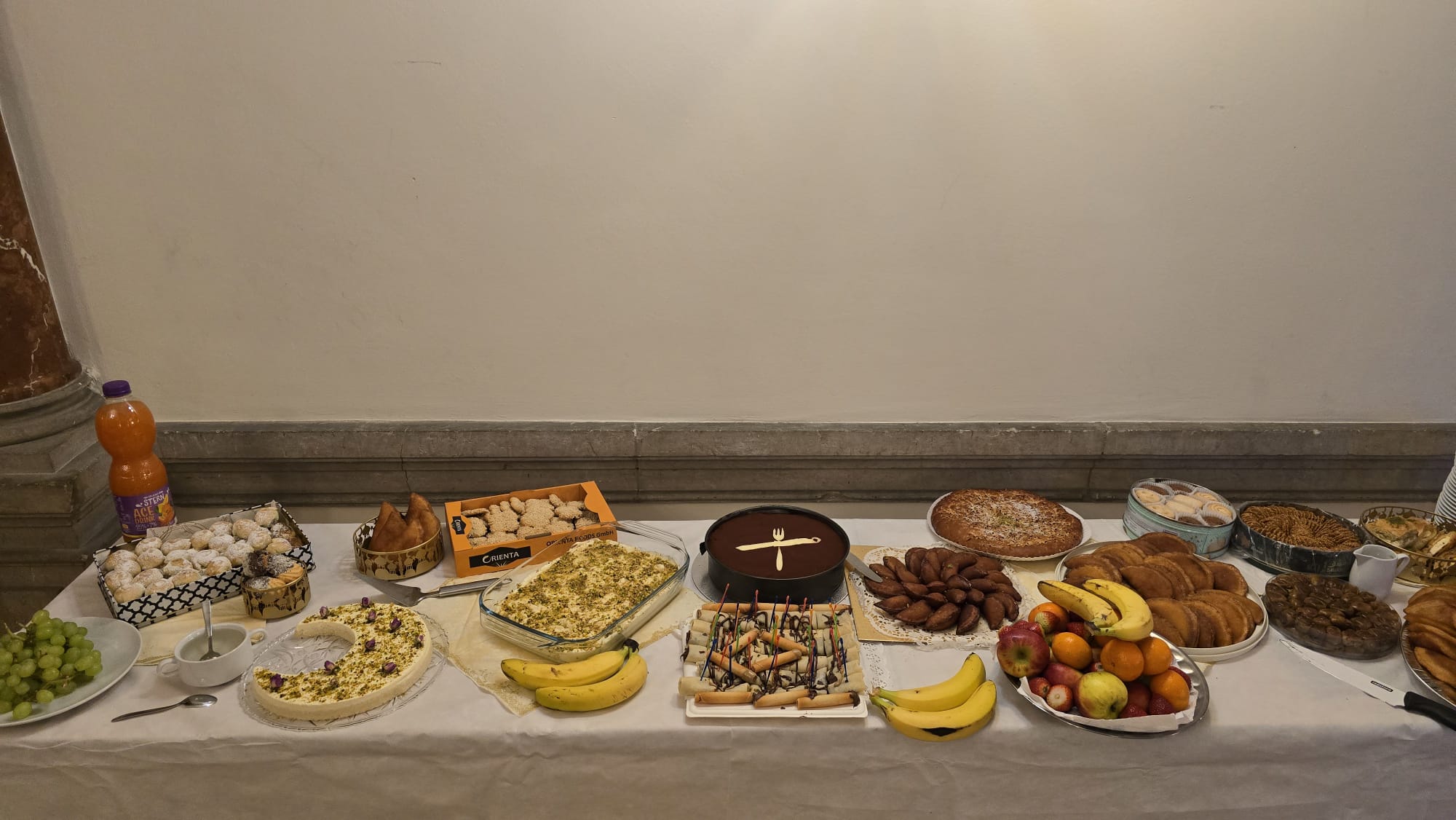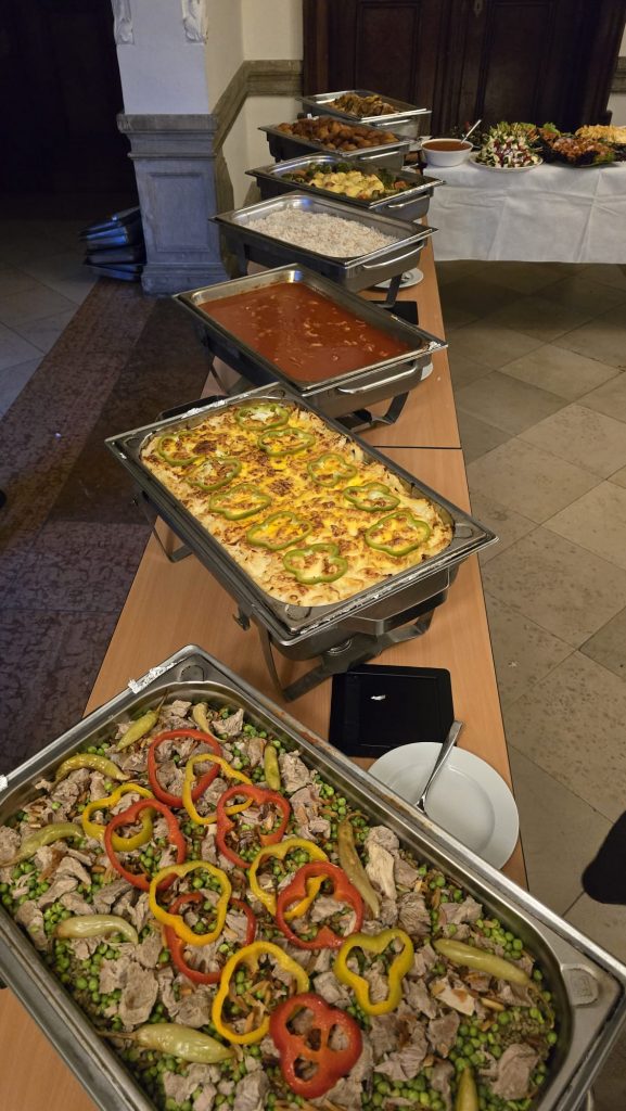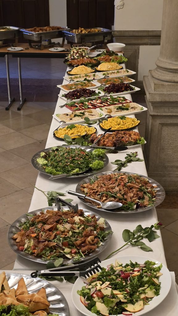 Um Punkt 18:16 Uhr ging es los. Die Besucherinnen konnten sich an einem reichhaltigen Buffet bedienen. Es gab zahlreiche arabische Speisen, zum Nachtisch auch selbstgebackene Süßigkeiten. Doch nicht nur das Essen stand bei der Veranstaltung im Mittelpunkt, sondern vor allem der Austausch untereinander. Eine lockere Runde soll es sein, bei der die Frauen miteinander ins Gespräch kommen, sagte Dalal Mirzo von der 2016 gegründeten Initiative “Frauen in Halle”. Diese hat zum Ziel, Brücken zu bauen und Engagement von Frauen zu stärken. Stolz zeigte sie sich, dass man das Fastenbrechen im Stadthaus durchführen darf. “Das zeigt uns, dass wir zu dieser Stadt dazugehören.” Im Rahmen der Veranstaltung wurden auch Spenden für ein Projekt in Syrien gesammelt. Diese soll syrischen Kindern wieder Schulunterricht ermöglichen. Es gab auch einen kleinen Basar mit Produkten wie Grußkarten, Ketten oder Töpfereiprodukten.