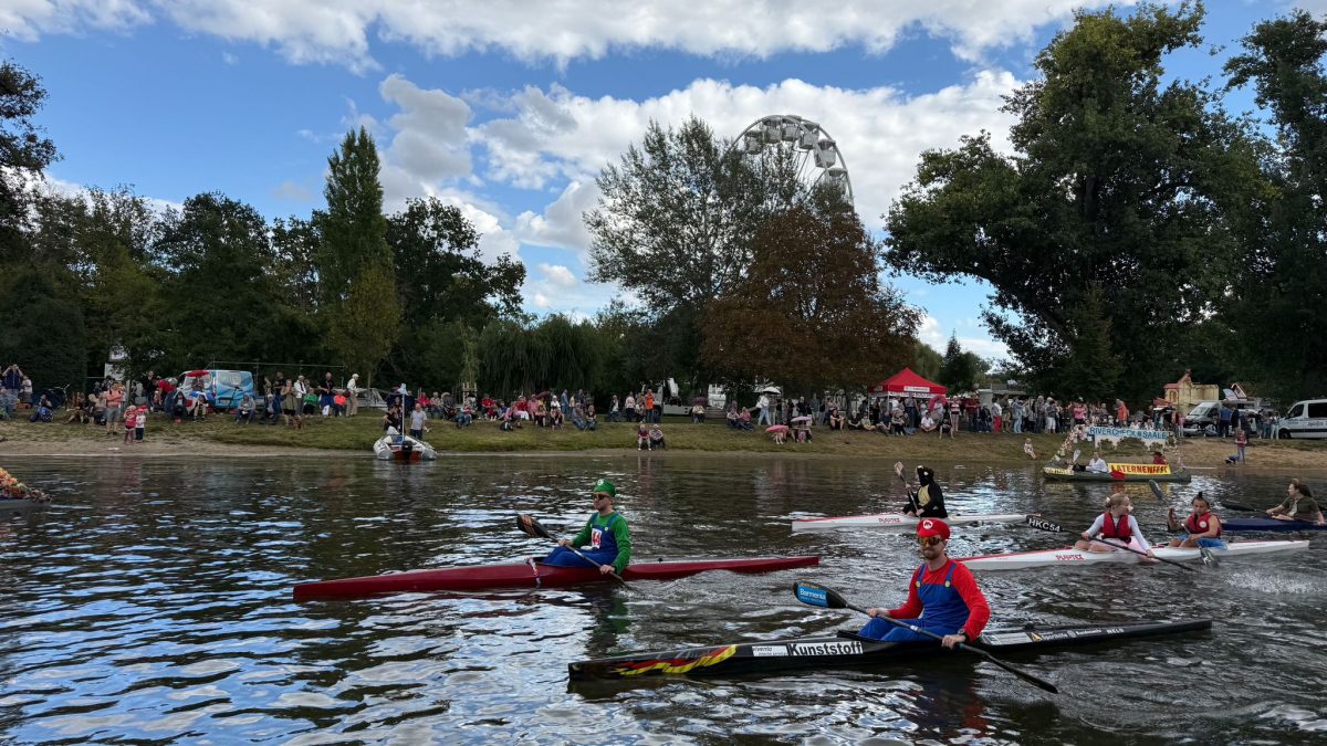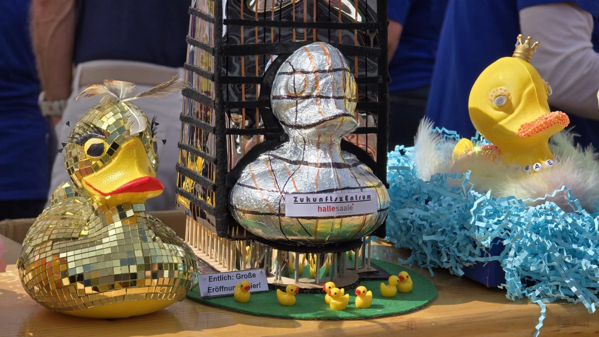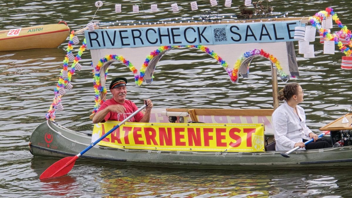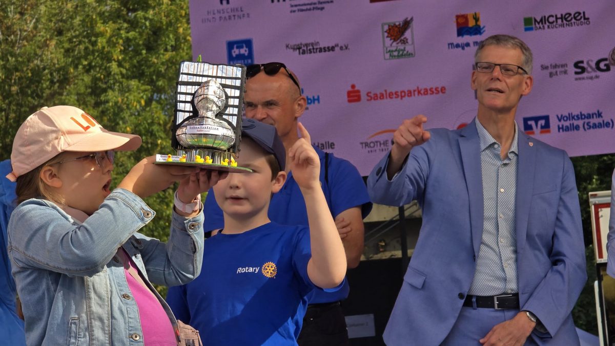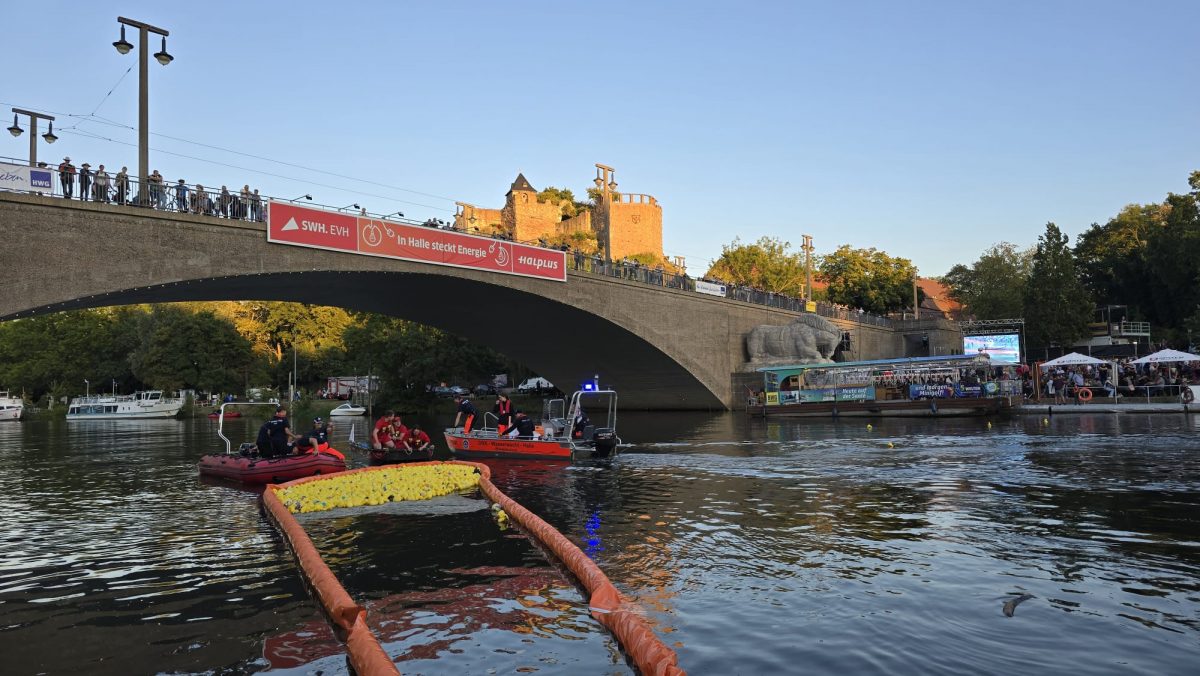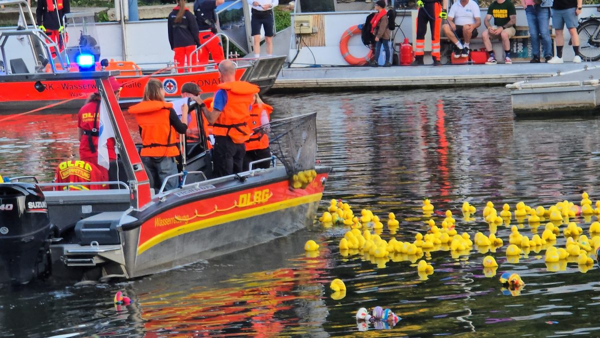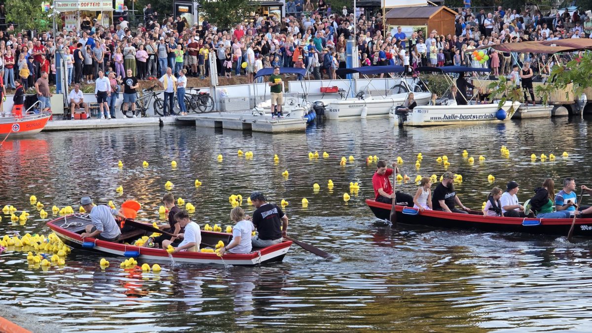 Am Abend wurde es dann schwimmend spannend: 3.000 quietschgelbe Plastikenten stürzten sich bei leichtem Strom in die Saale – beim traditionellen Rotary-Entenrennen. Nicht alle kamen schnell voran, aber für Stimmung sorgte das bunte Gewusel allemal.