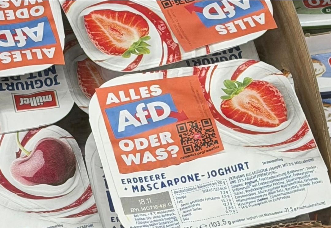 Das Kleingedruckte verrät, dass der Code zu Campact führt. Auf der Website wird die Aktion beworben: „Ein AfD-Logo im Supermarkt? Mit unseren Aufklebern auf Müllermilch und Co. klärst Du direkt im Supermarkt auf – nimm die Sticker in den Supermarkt mit und klebe sie einfach auf Müller-Produkte im Kühlregal.“ Die Organisation versendet dafür kostenfreie Stickerpakete an Interessierte.