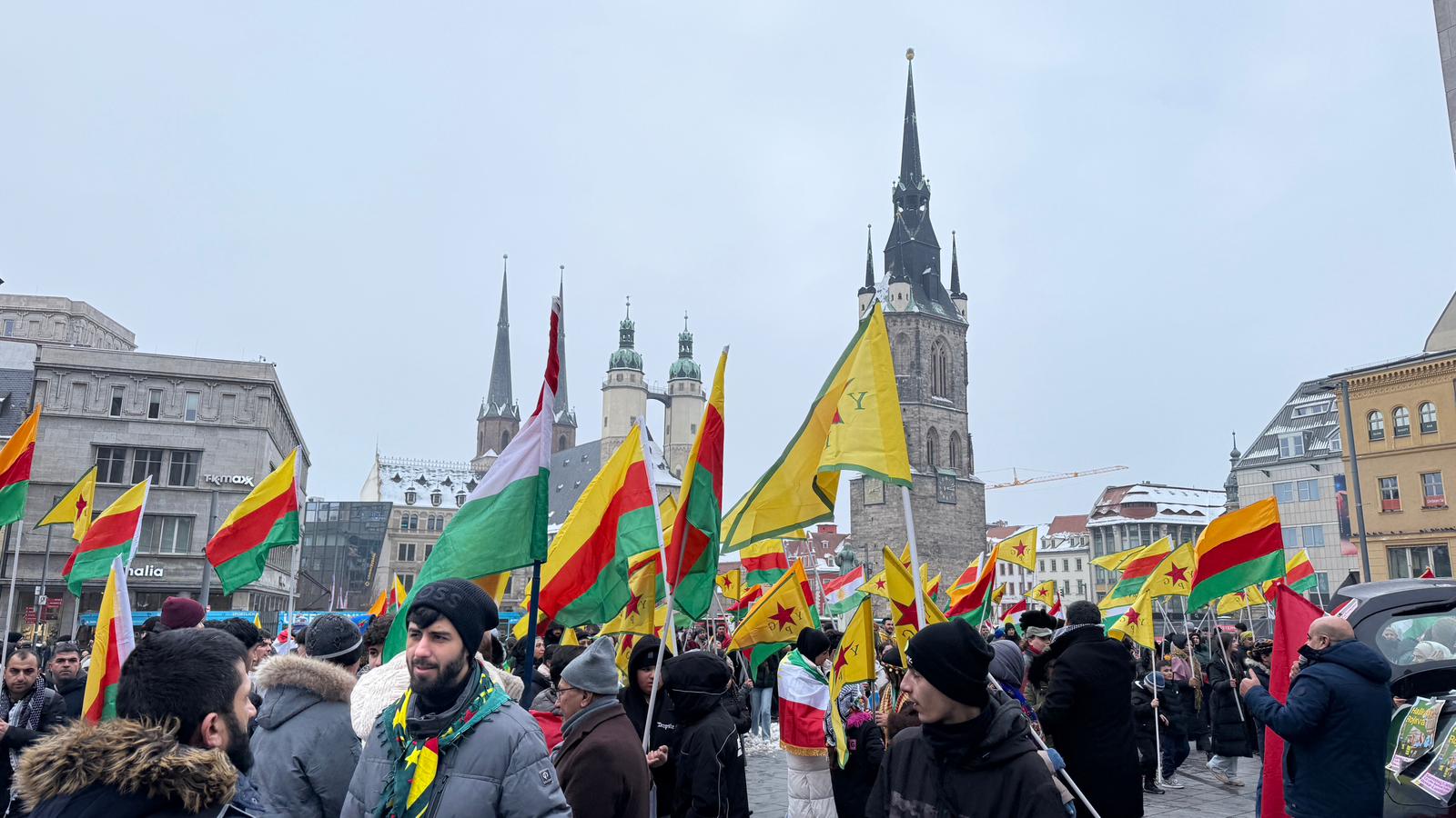 Eine Demonstration für ein freies Kurdistan ist am Samstagnachmittag durch die hallesche Innenstadt gezogen. Vom Landesmuseum aus ging es für die rund 300 Teilnehmenden bis zum Marktplatz. Kurdische Nationalflaggen wehten, ebenso wie Flaggen der Kurdischen Volksbefreiungseinheiten YPG.