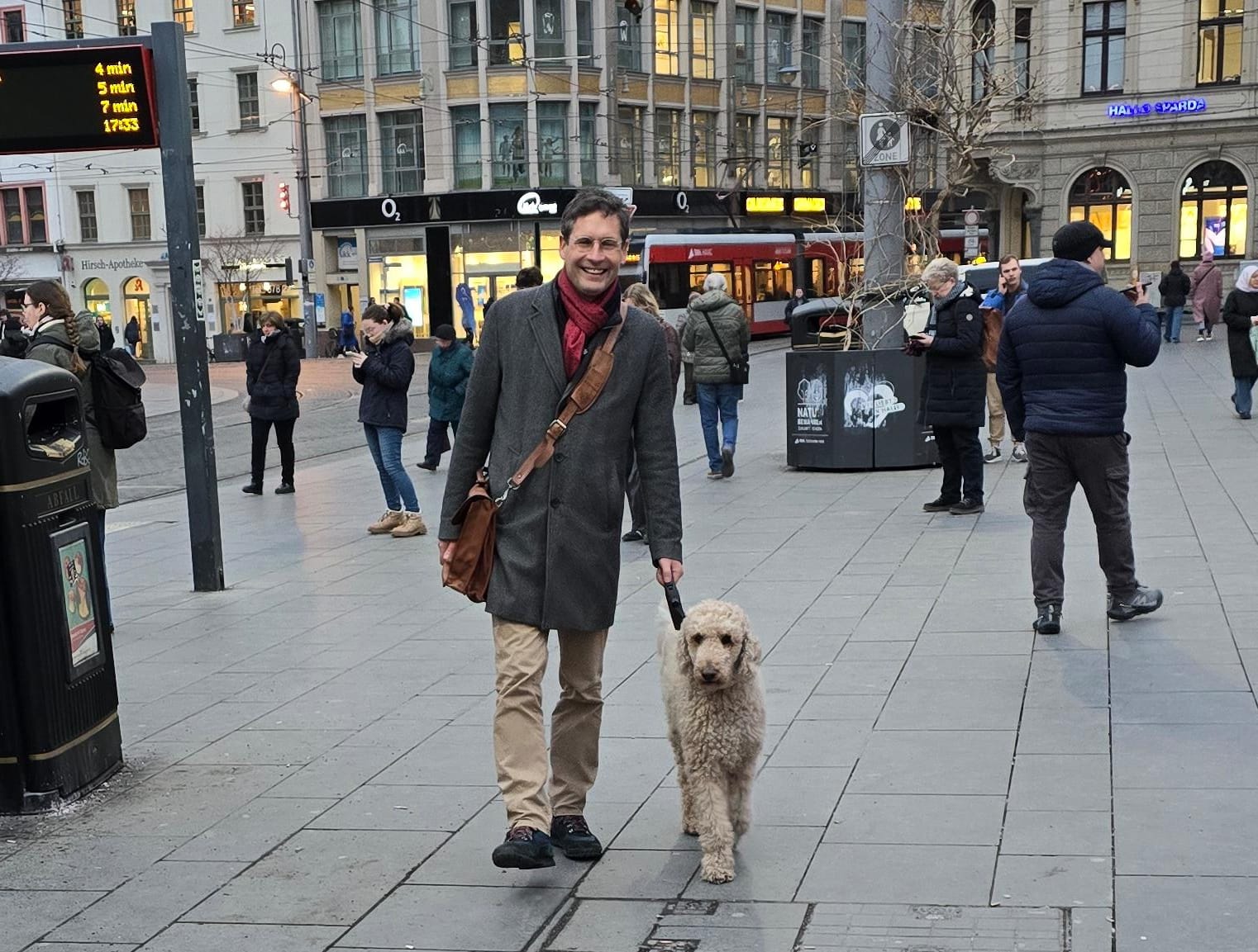Am Roten Turm stand der parteilose OB-Kandidat Alexander Vogt und verteilte Heißgetränke. “Es wird nach 40 Jahren mal wieder Zeit für einen Hallenser”, meinte Vogt. Damit spielt er natürlich auf die Herkunft von Egbert Geier an, der aus Baden-Württemberg kommt, allerdings mittlerweile auch schon seit 19 Jahren in Halle wohnt. “Hallenser” ist tatsächlich für einige ein Wahlkriterium, wie sich in Gesprächen zeigte. Allerdings nicht für alle. “Ist er nun Halle-Neustädter oder Hallenser”, fragte ein Mann im Vorbeigehen seine Frau und fand Vogts Anspielung auf die Herkunft übertrieben.