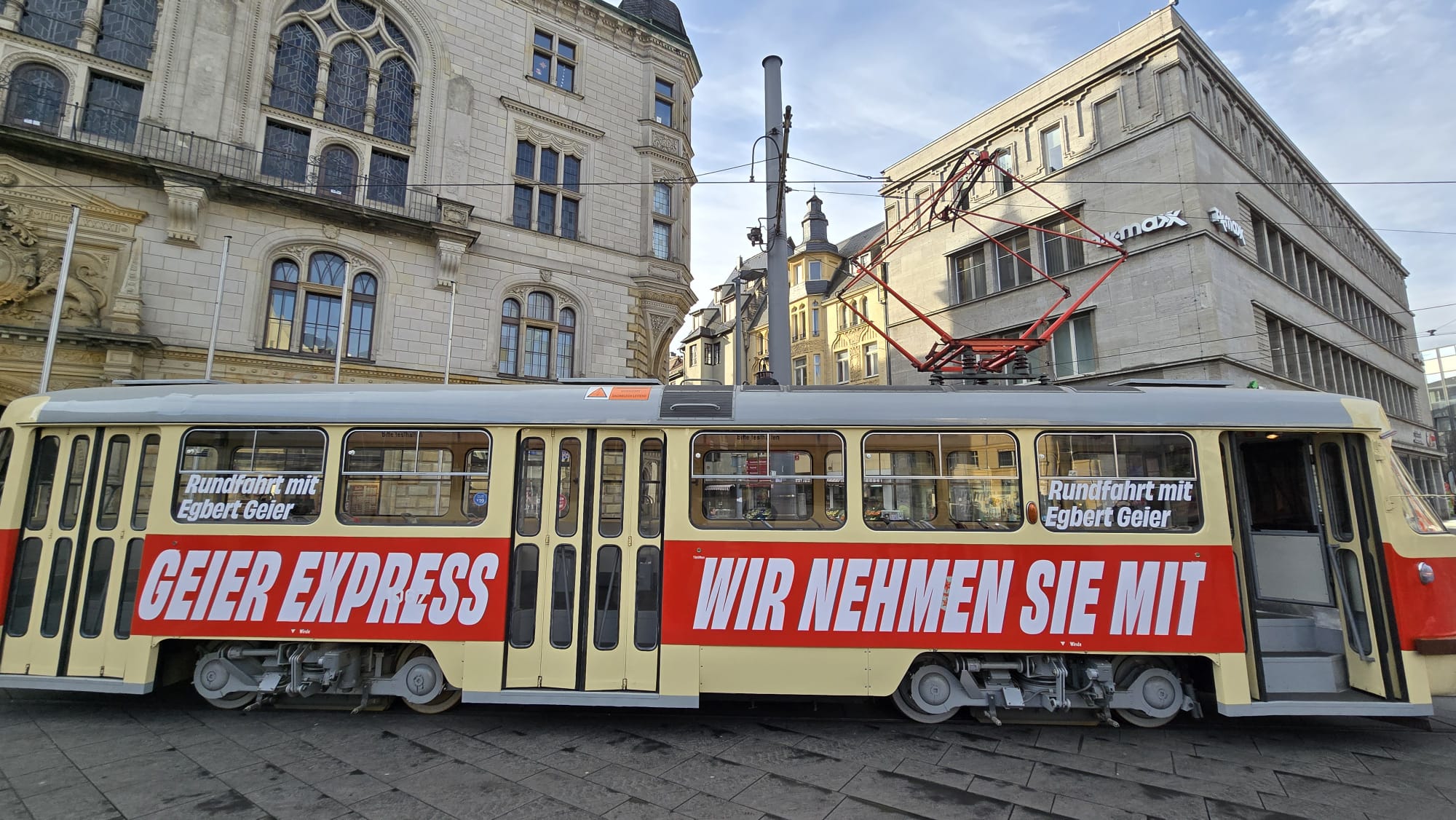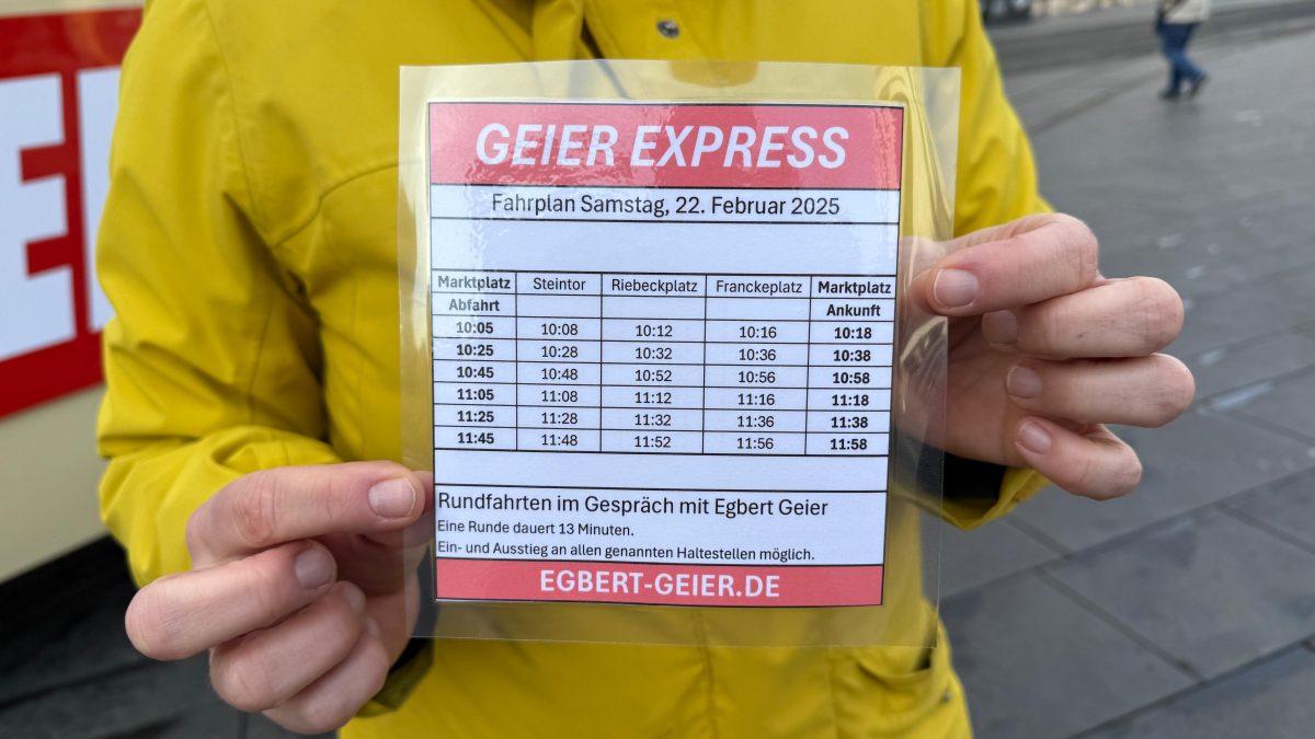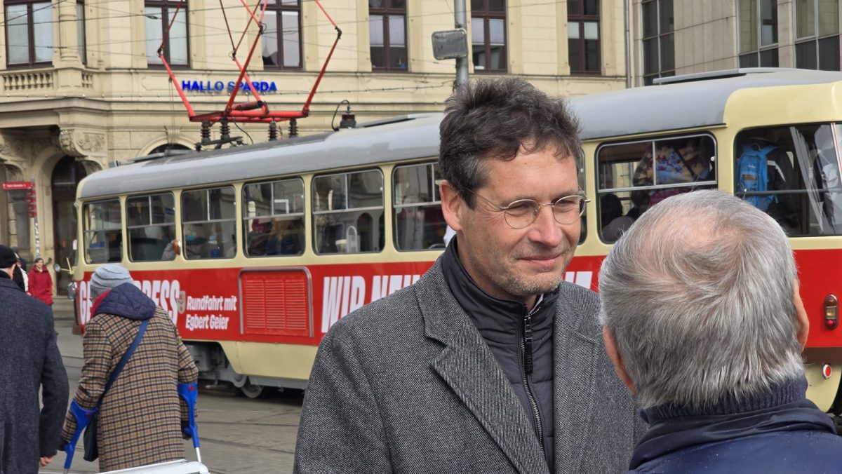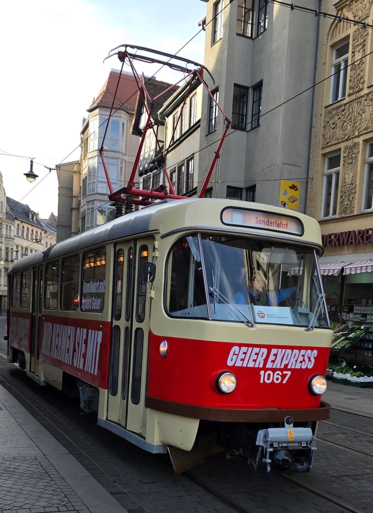 Eine historische Tatra-Straßenbahn ließ Egbert Geier rollen. Der “Geier-Express” rollte auf dem Rundkurs Markt – Steintor – Riebeckplatz – Markt. Eine Mitfahrt war kostenlos. Geier unterhielt sich mit den Fahrgästen über ihre Wünsche und Sorgen. “Ich habe sie schon in der ersten Wahl gewählt und jetzt natürlich wieder”, sagte eine andere Frau. Geiers unaufgeregte Art wurde gelobt. Und ein Mutter-Tochter-Gespann – mit 16 ist auch die Tochter wahlberechtigt – entschied sich wegen dessen realistischer Aussagen für Geier. Vogt habe alles mögliche im Wahlkampf versprochen. Dabei sei doch schon von vornherein klar, dass dies sich in der Form nicht umsetzen lasse.